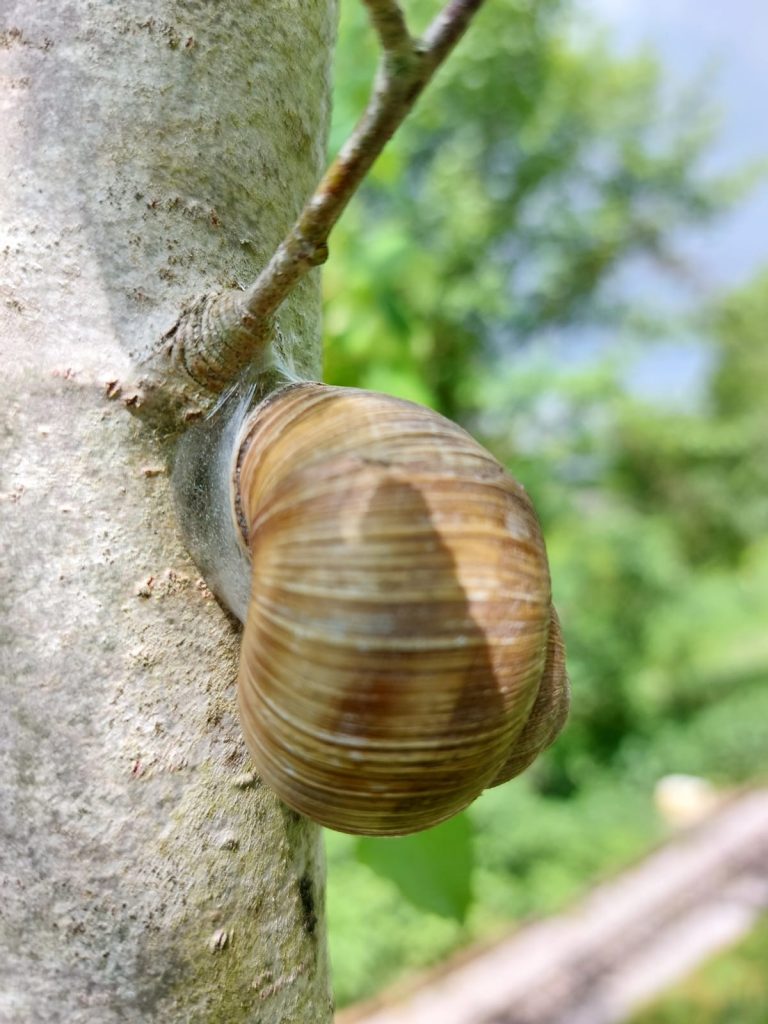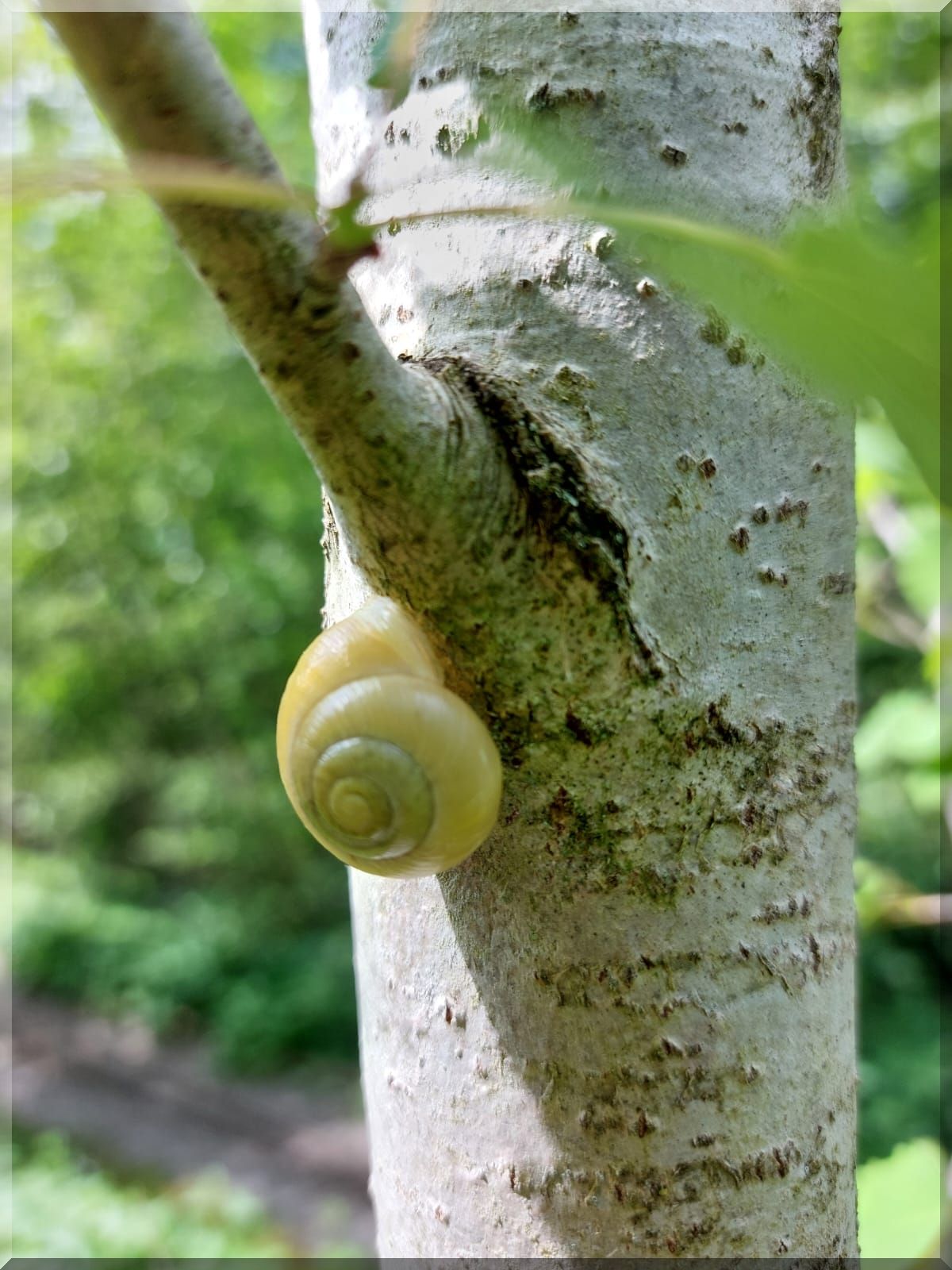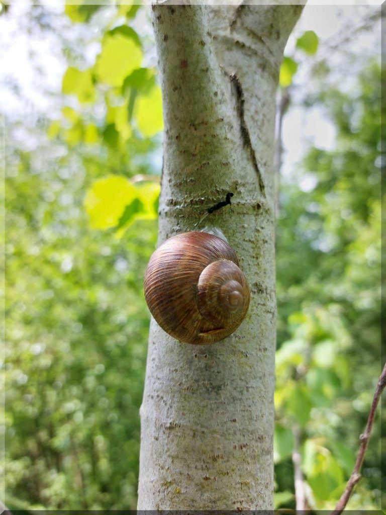 Gleich zu Beginn des Spazierganges fielen uns an einem zarten Baumstamm Schnecken auf, die sich in die Höhe gearbetet hatten. Wo wollen sie denn hin – himmelwärts.