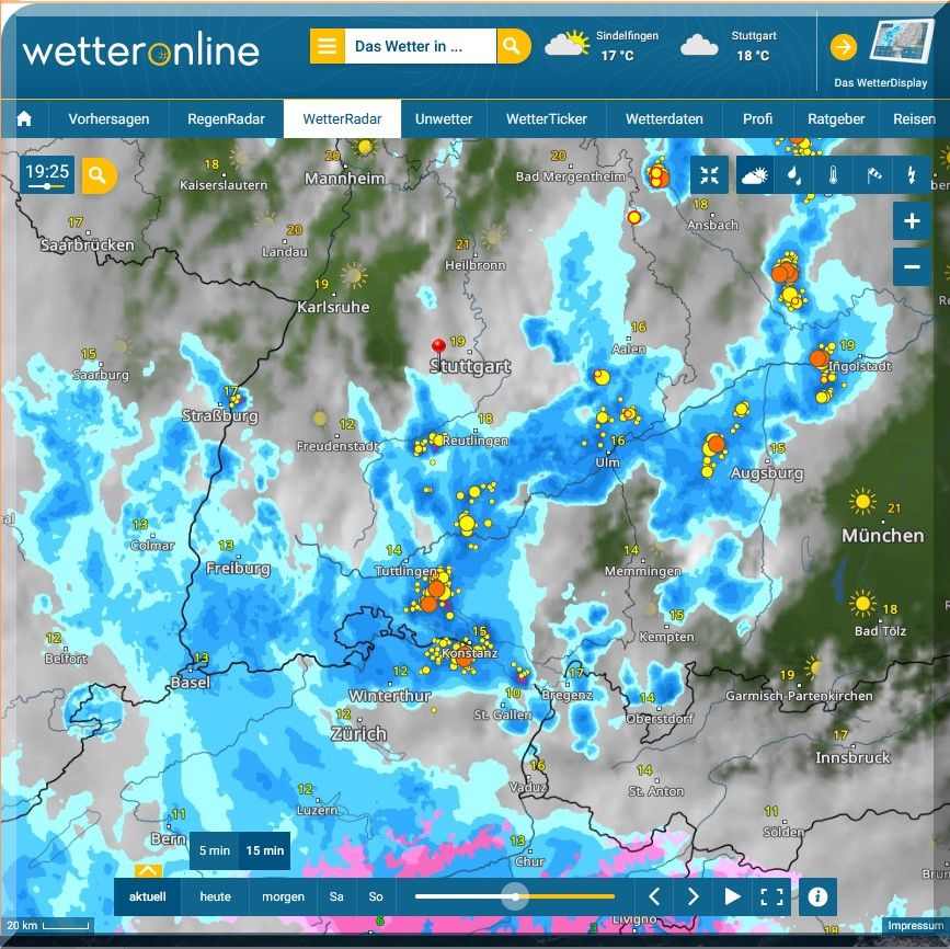 21:30 Uhr – Nun erwischt uns ein erstes schweres Gewitter, dessen Kern derzeit zwischen Sindelfingen und Suttgart liegt.