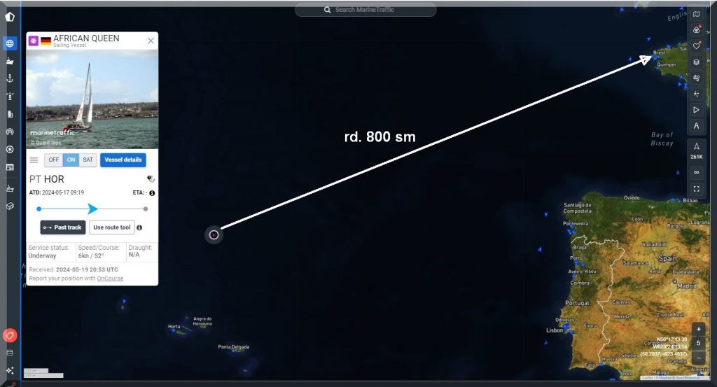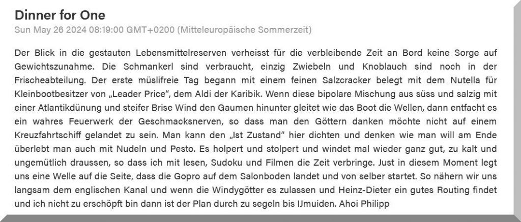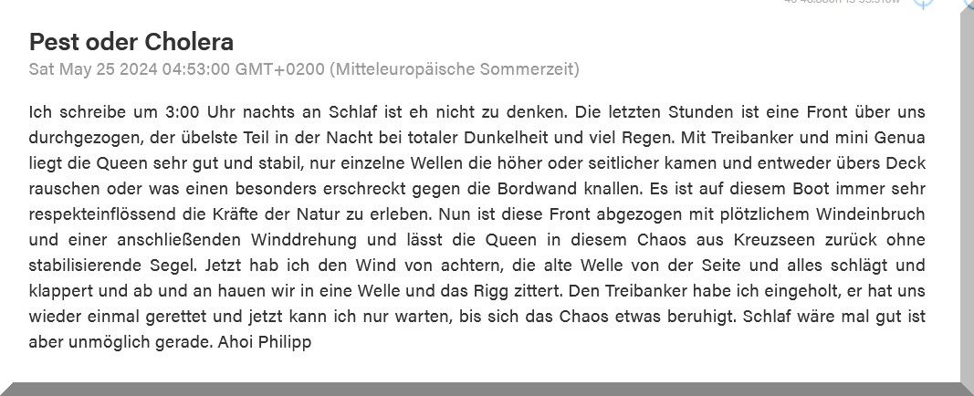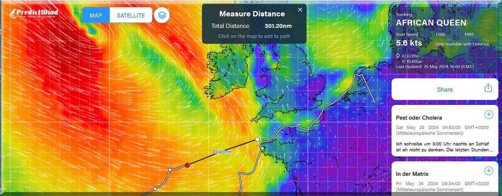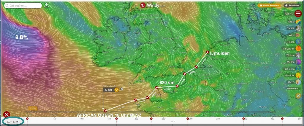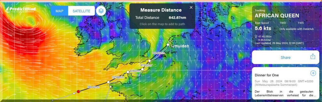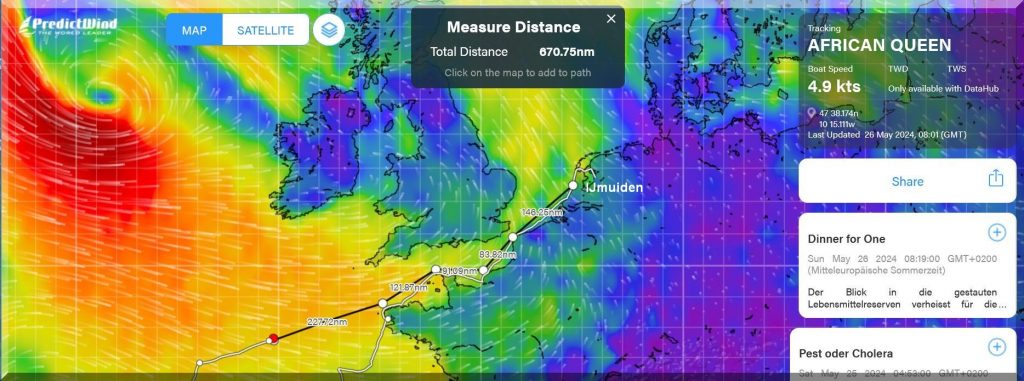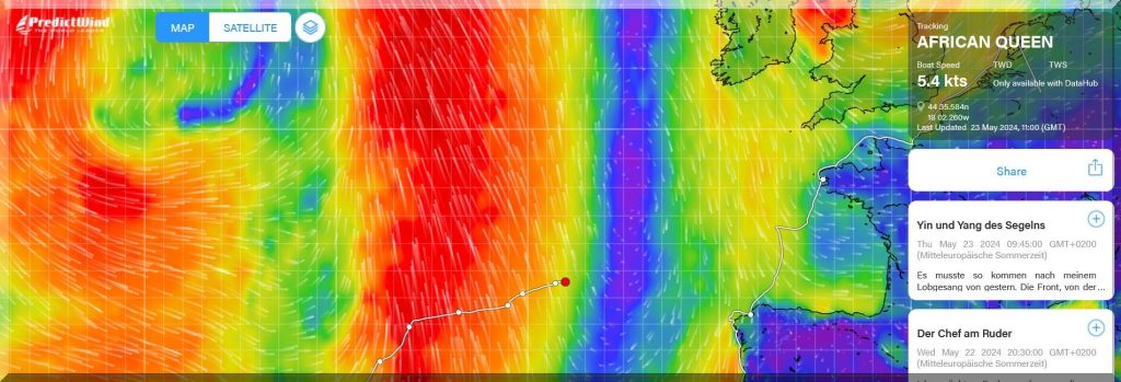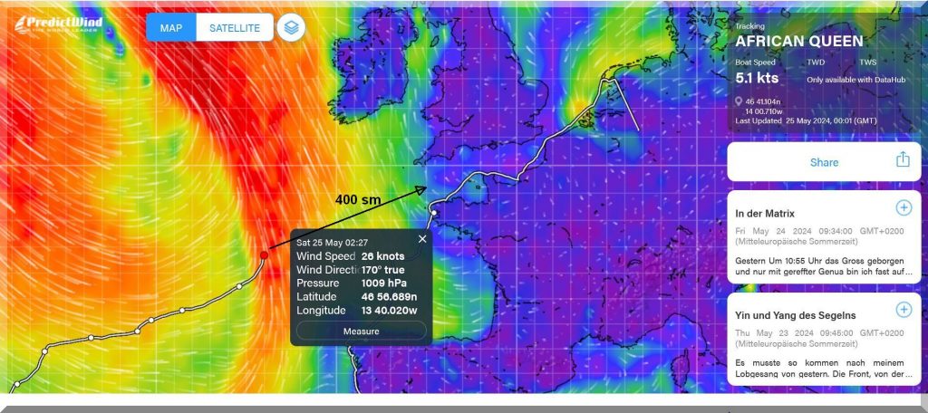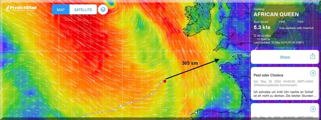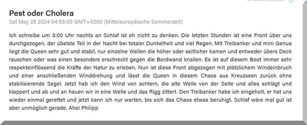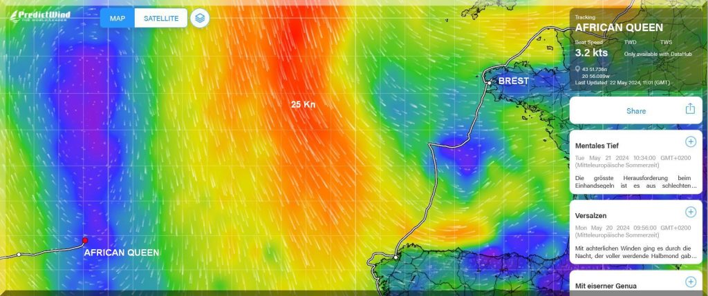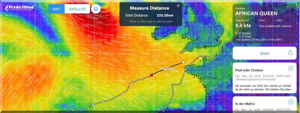 13:15 Uhr – Philipp hat noch mind. 750 sm bis Brest. Im Moment etwas schwachwindig, aber ein Starkwindgebiet nähert sich von Norden, das ihm nahezu einen Amwindkurs aufzwingen wird. Wenn er Glück hat, kann es auch ein Halbwindkurs werden.