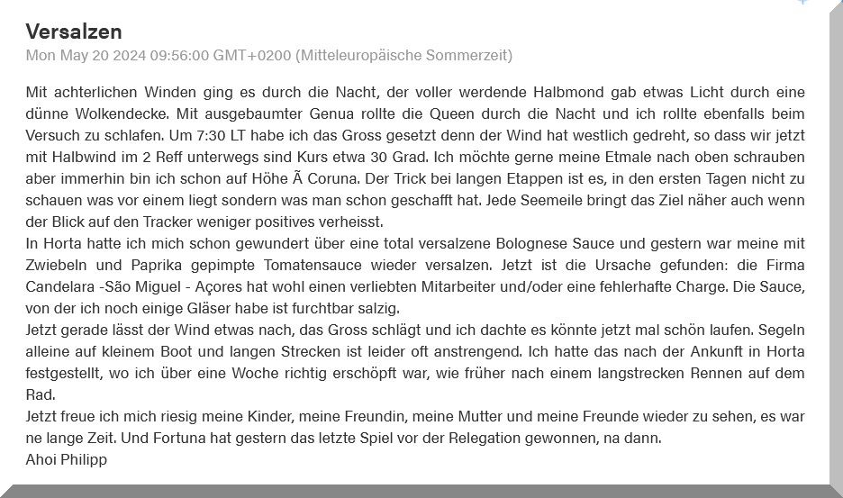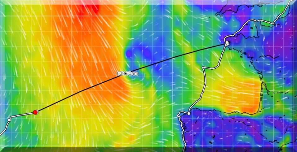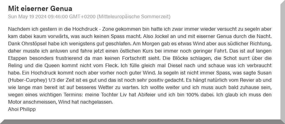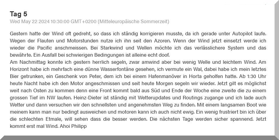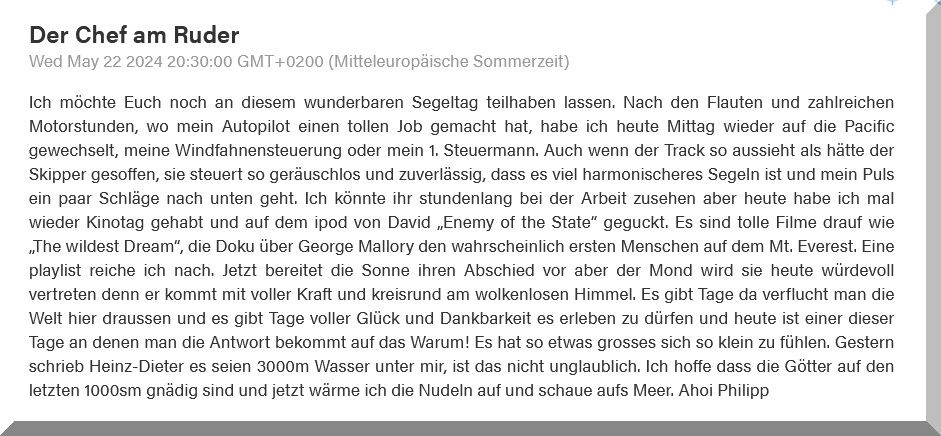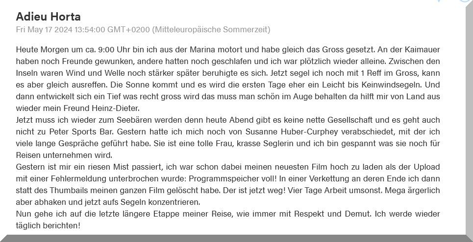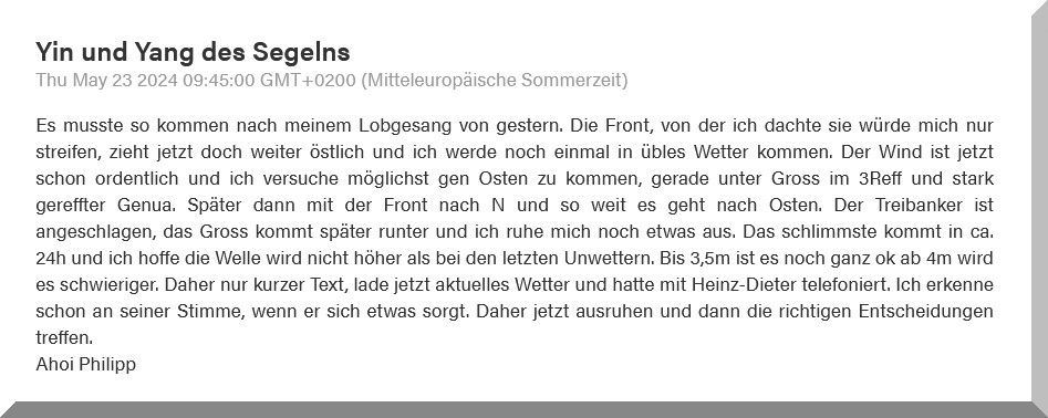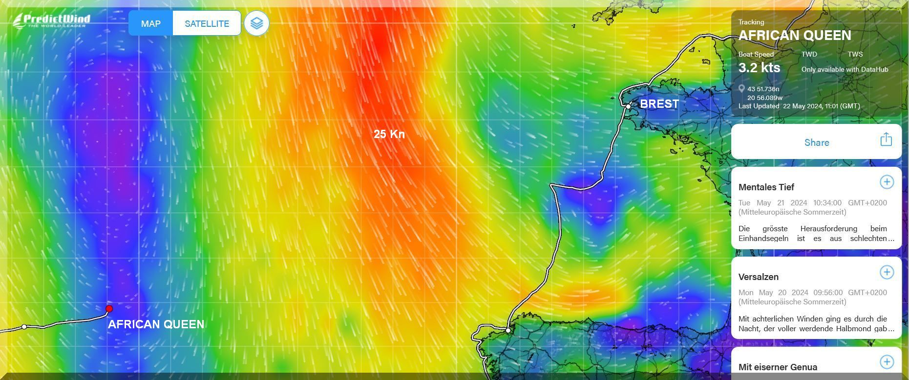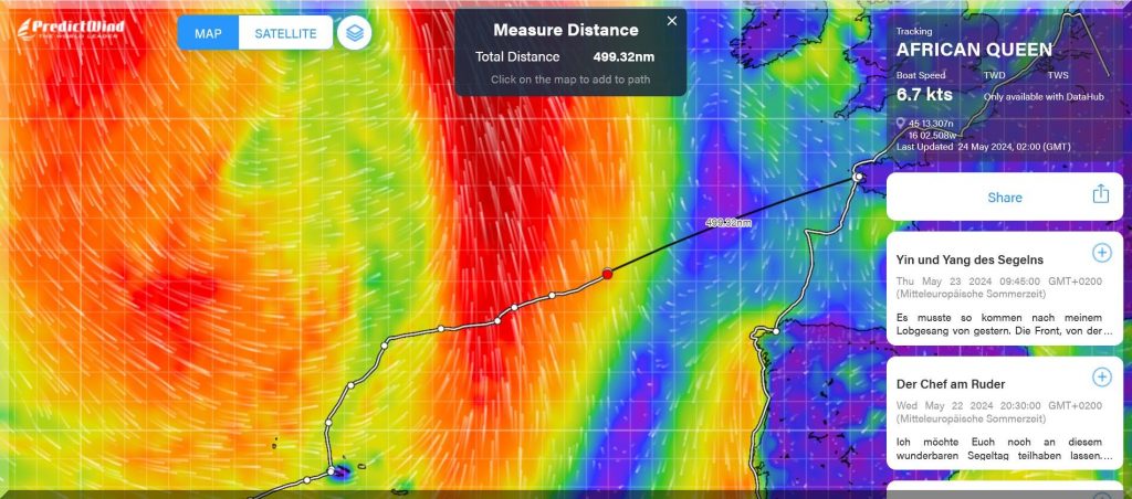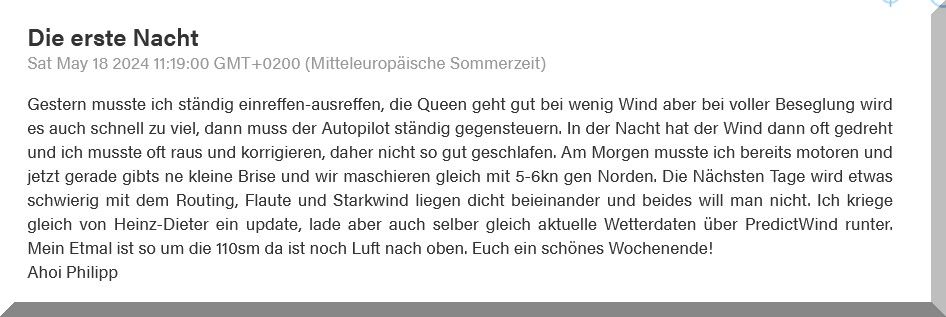 13:15 Uhr – Philipp hat noch mind. 750 sm bis Brest. Im Moment etwas schwachwindig, aber ein Starkwindgebiet nähert sich von Norden, das ihm nahezu einen Amwindkurs aufzwingen wird. Wenn er Glück hat, kann es auch ein Halbwindkurs werden.