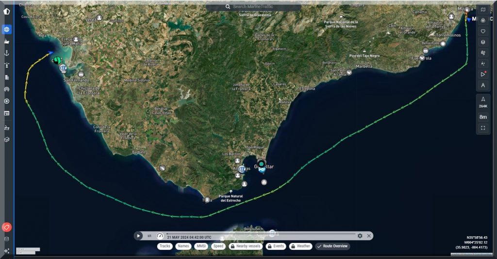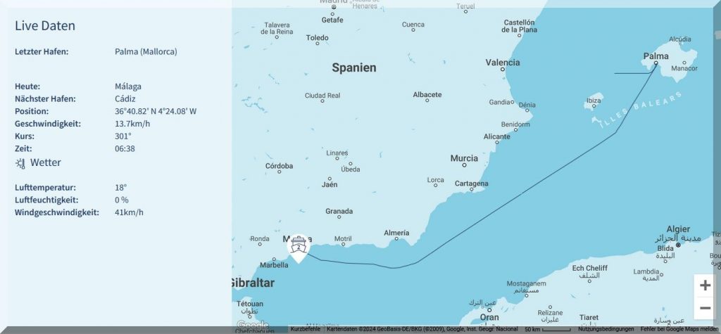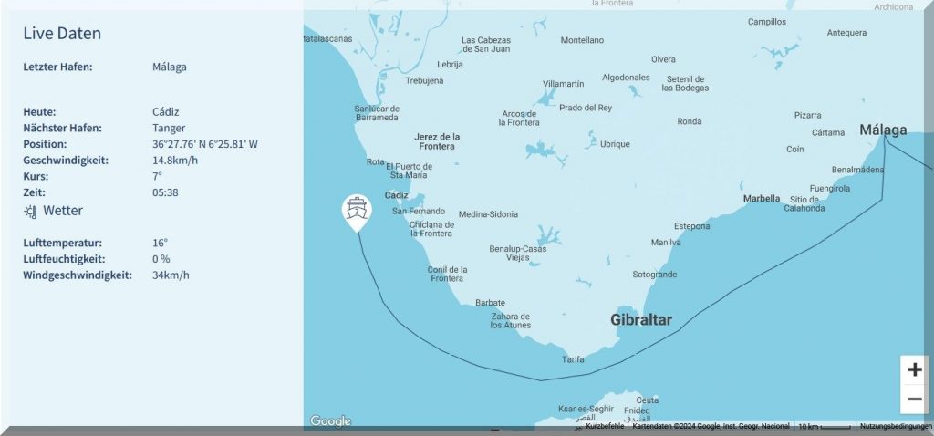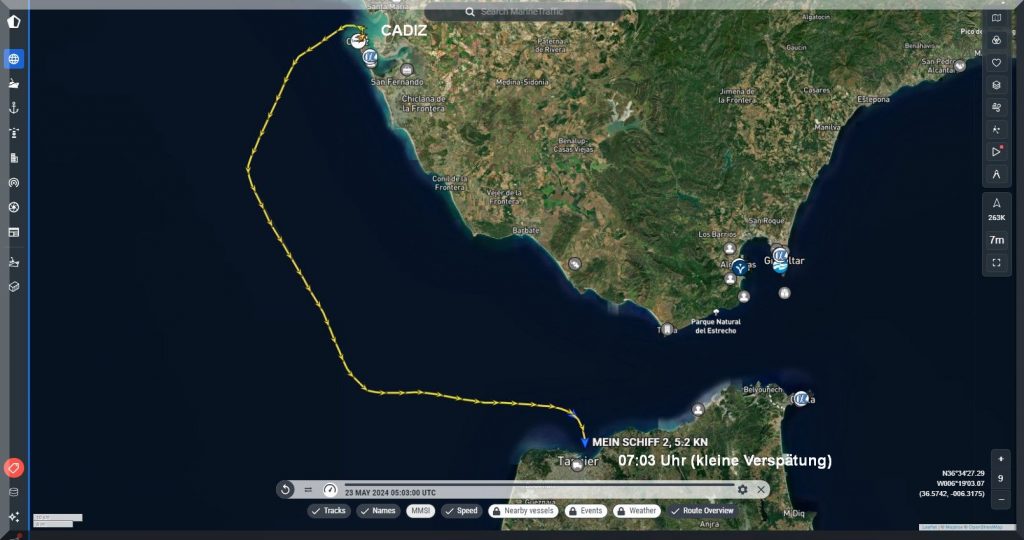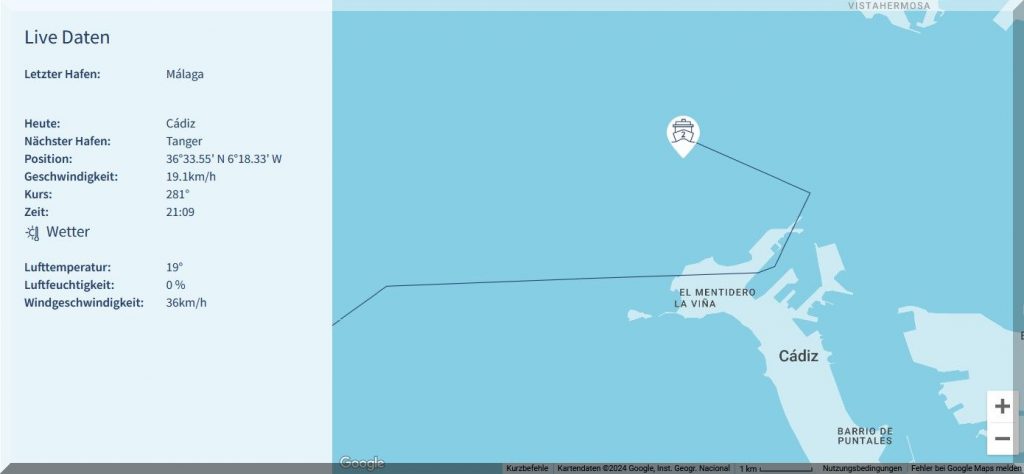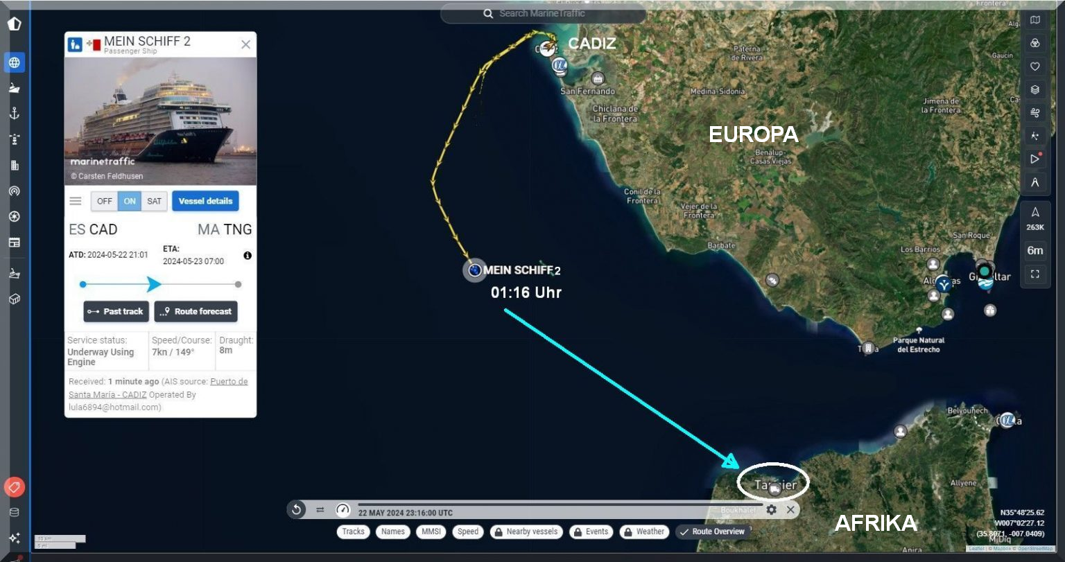 Pünktlich um 21 Uhr hat das Kreuzfahrtschiff Mein-Schiff-2 Cadiz verlassen und soll morgen um 7 Uhr in Tanger einlaufen.