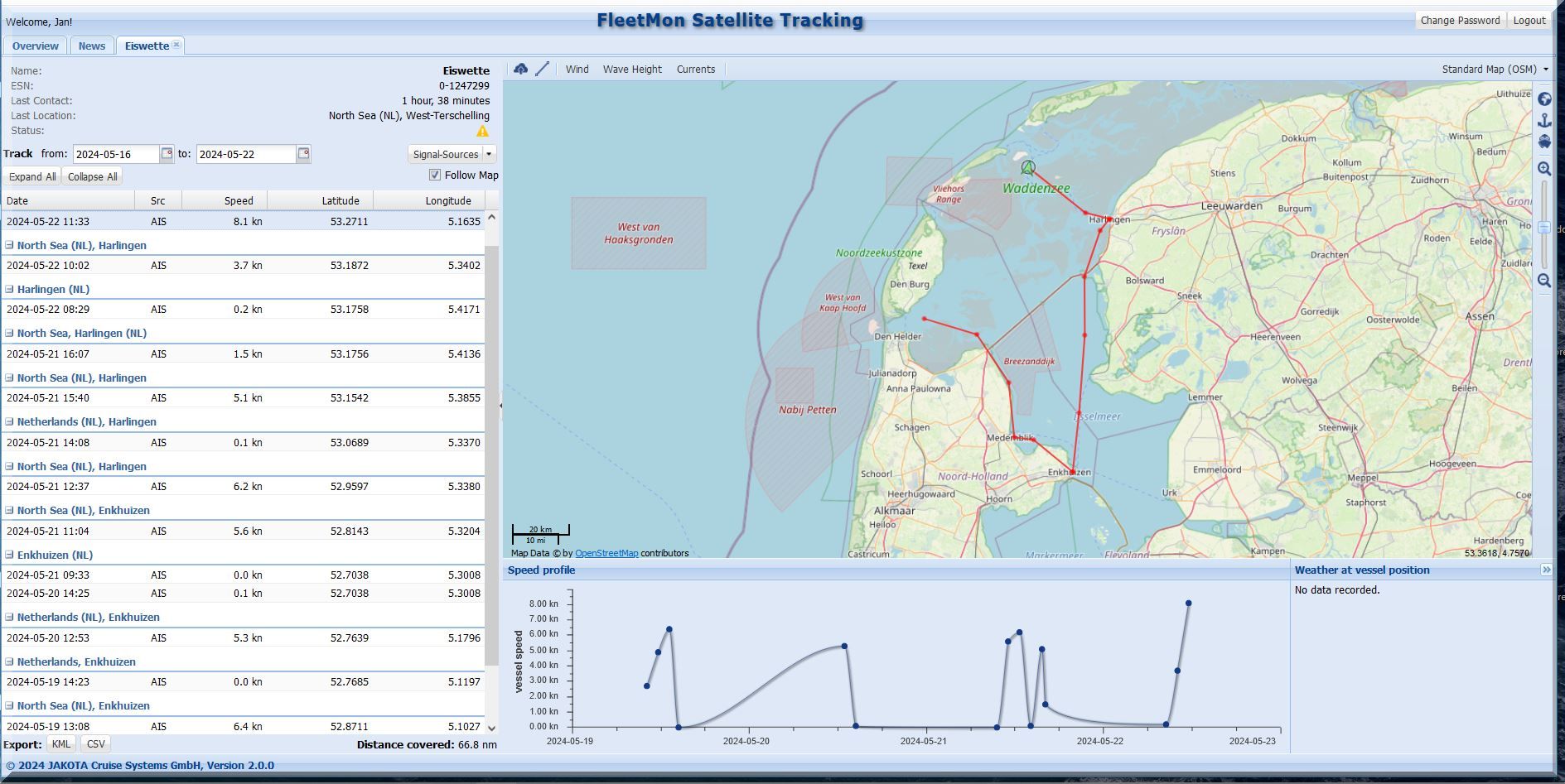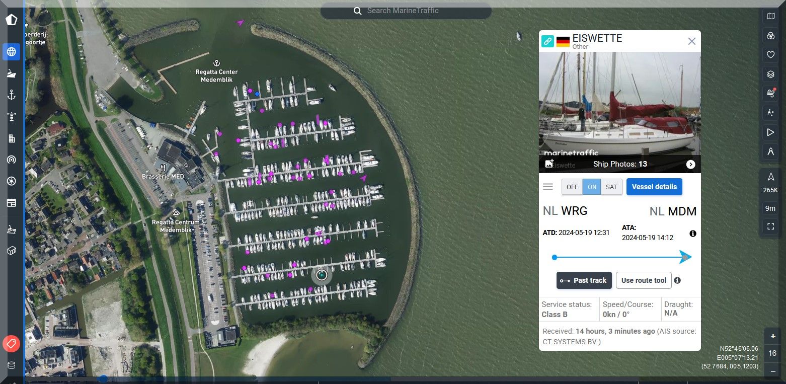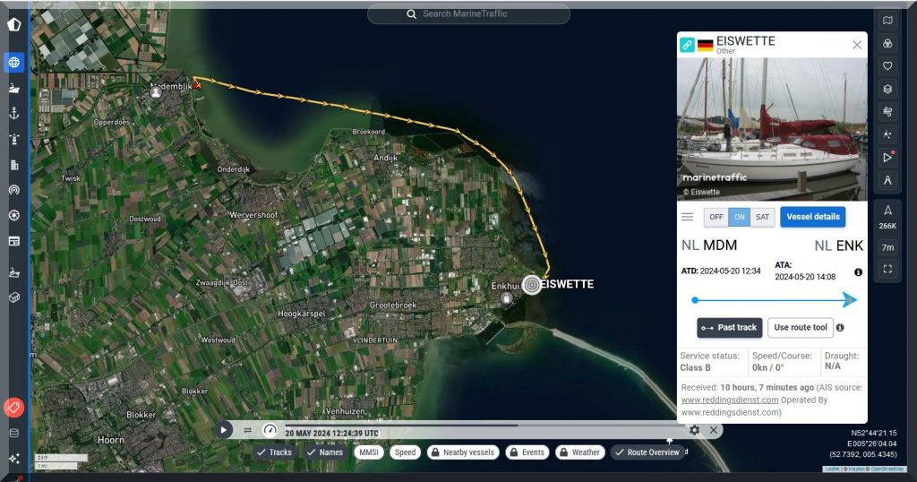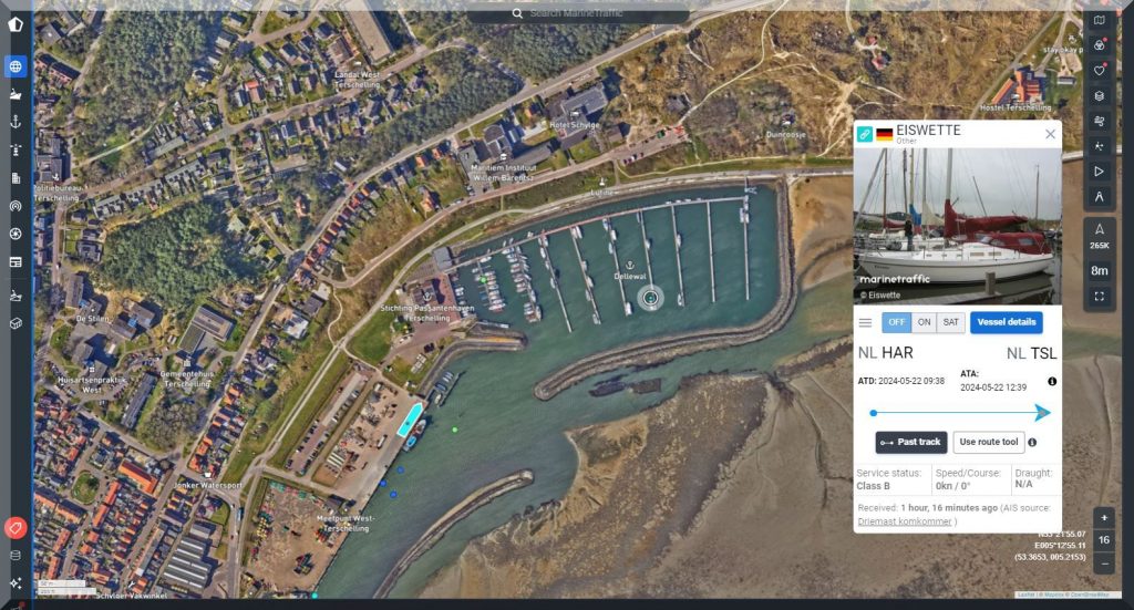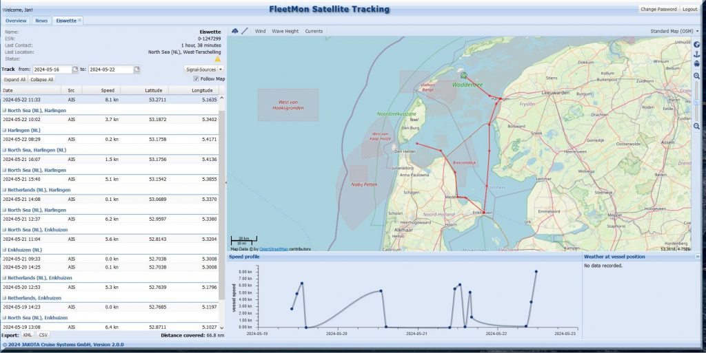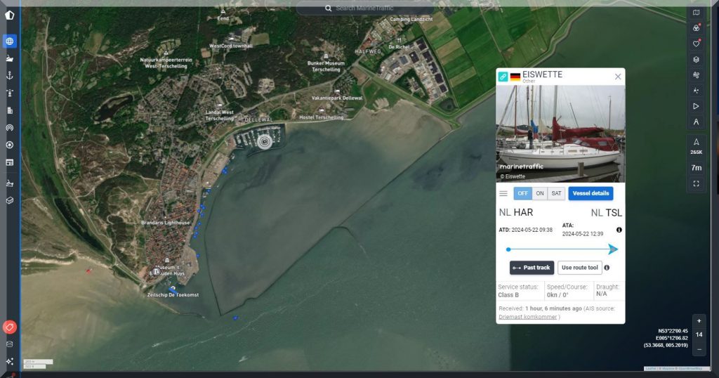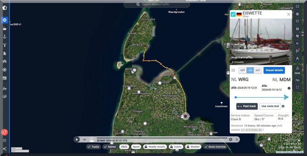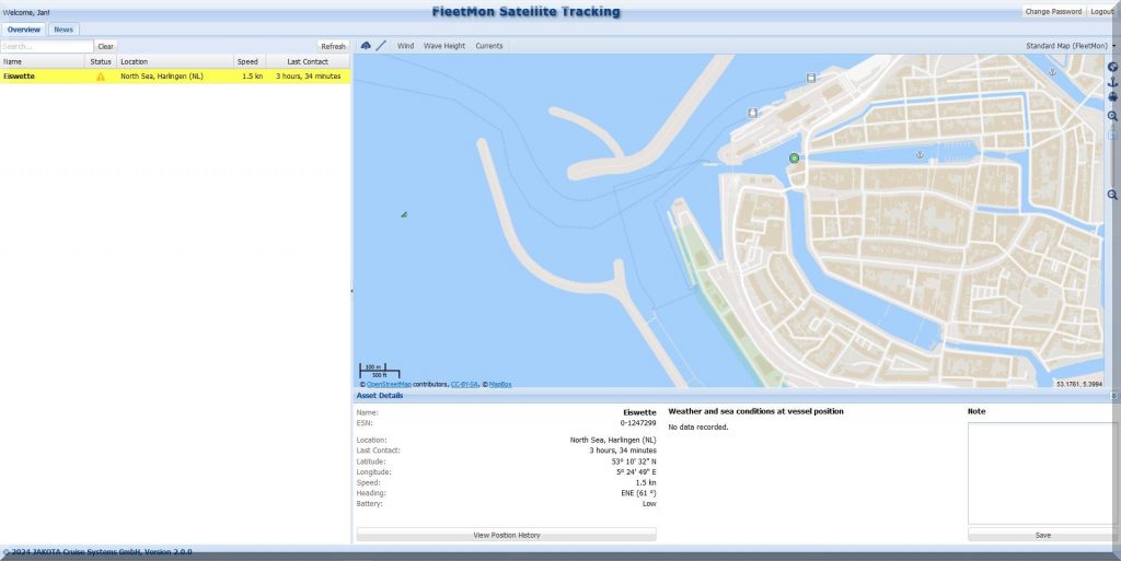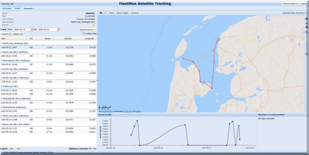 Und wo steckt die SY EISWETTE? Auf MarineTraffic kann ich sie im Moment nicht finden, aber Jan hat ja noch seinen FleetMon Satellite Tracker, vielleicht werde ich da fündig: Ja, er ist in Harlingen.