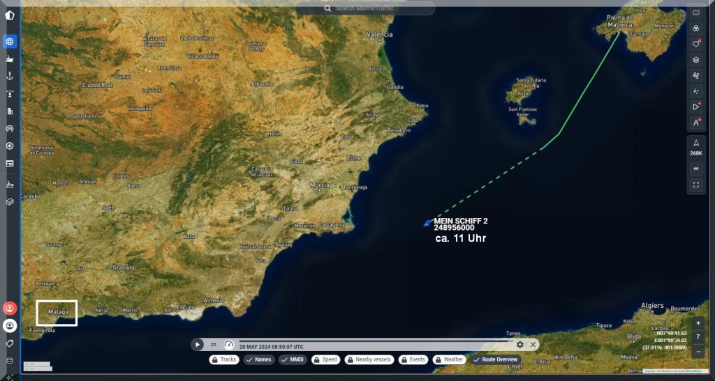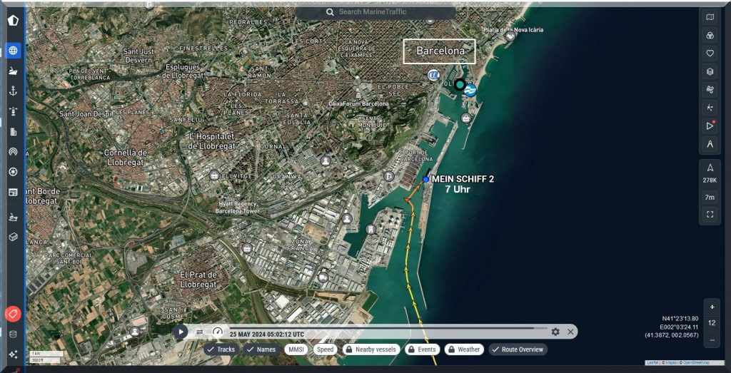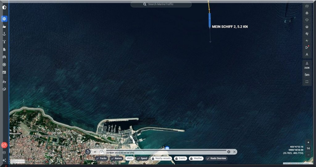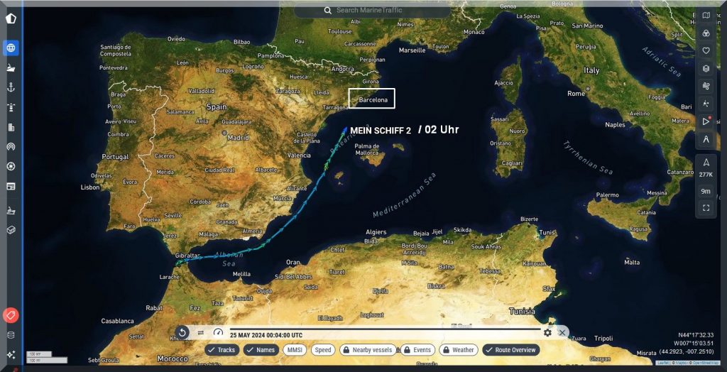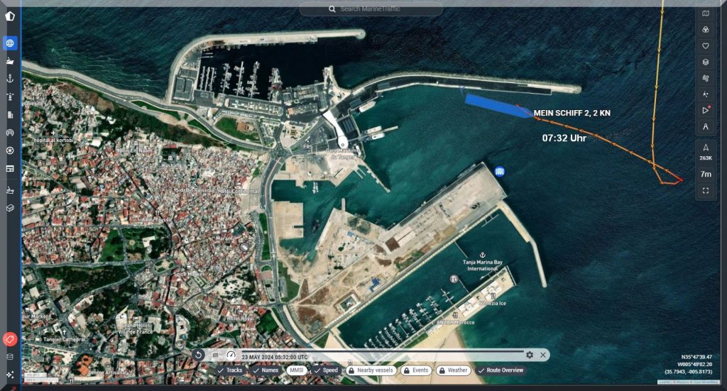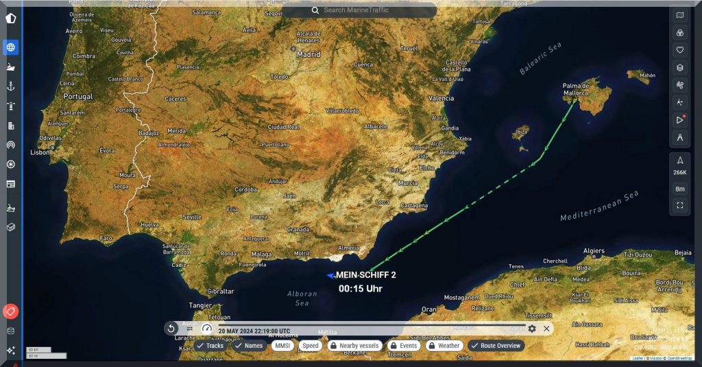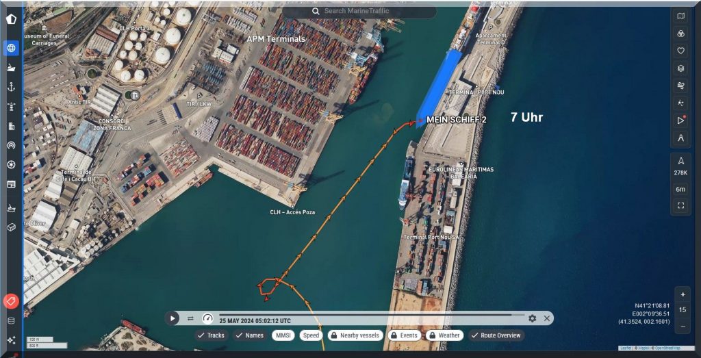 3 Uhr nachts – Ich kann nicht schlafen, also schaue ich mal, ob ich Mein-Schiff-2 auf Marinetraffic entdecken kann, denn um 22 Uhr gestern Abend soll es abgelegt haben:
