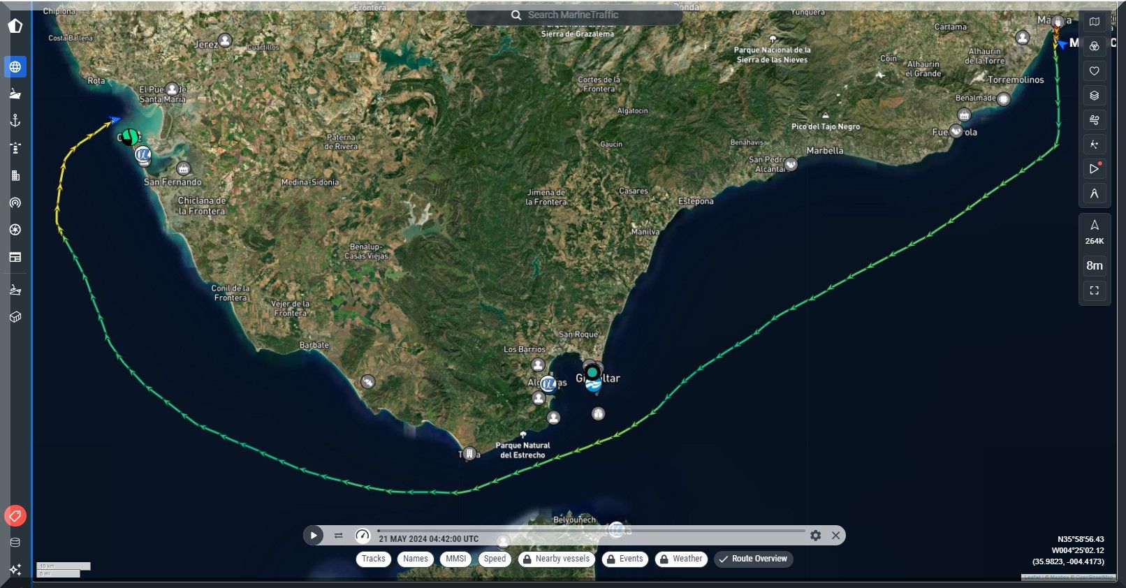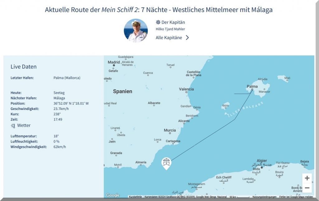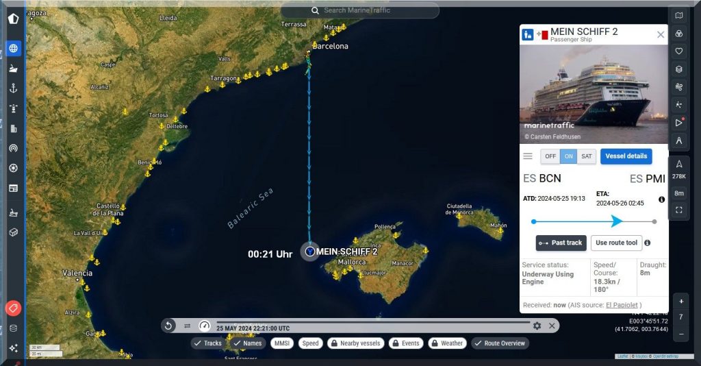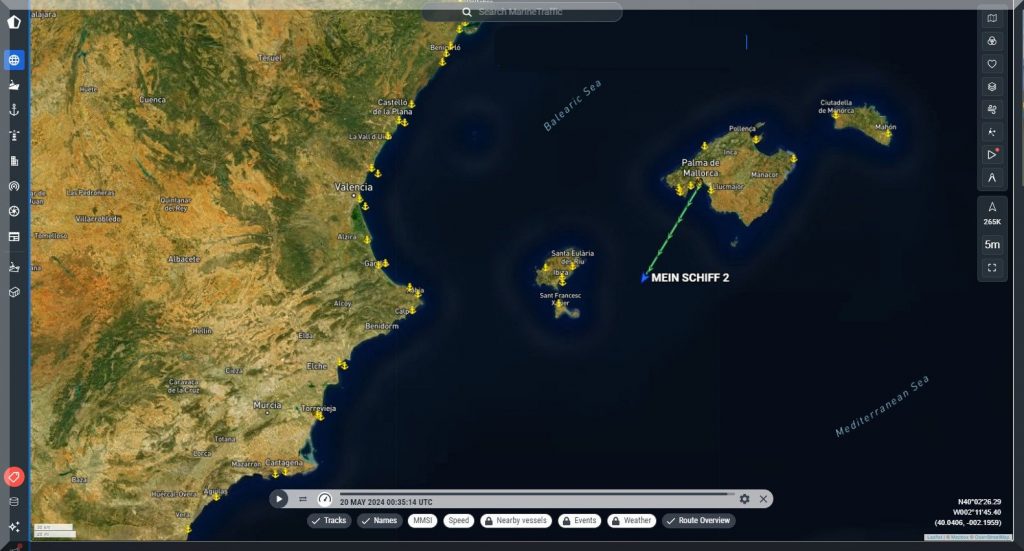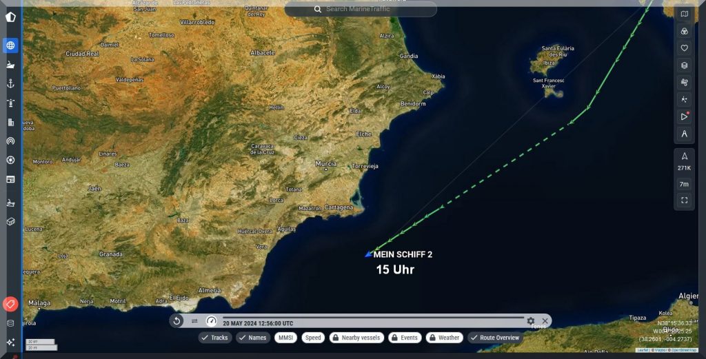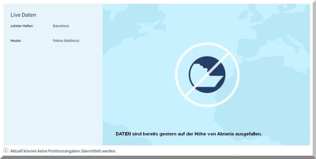 3 Uhr nachts – Ich kann nicht schlafen, also schaue ich mal, ob ich Mein-Schiff-2 auf Marinetraffic entdecken kann, denn um 22 Uhr gestern Abend soll es abgelegt haben: