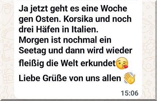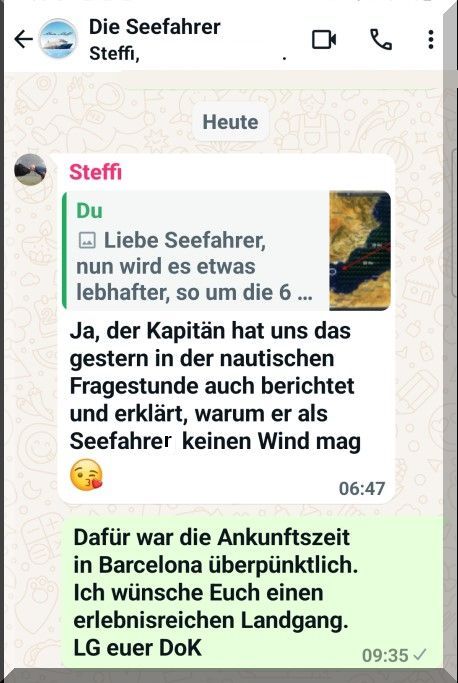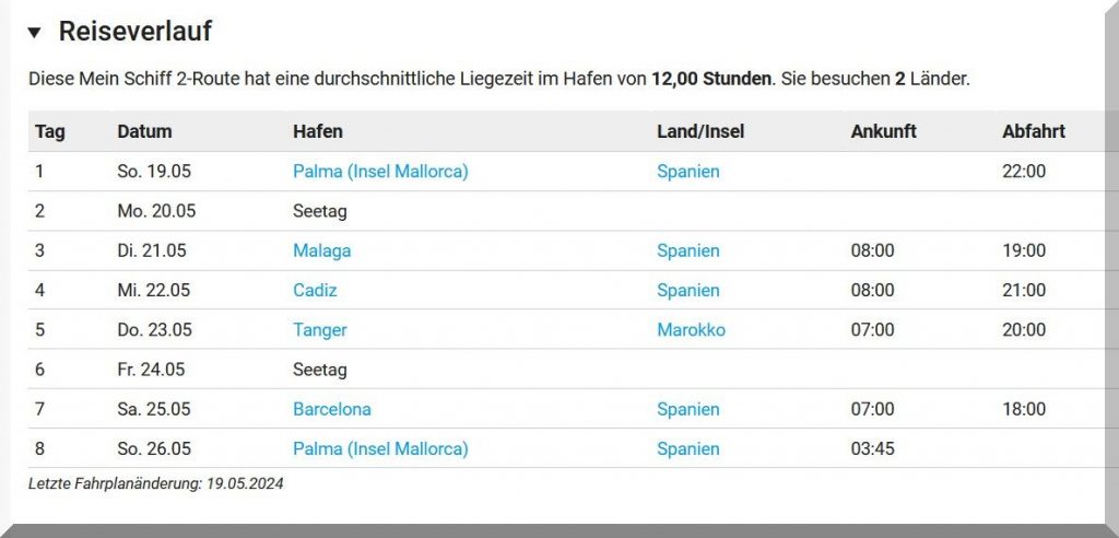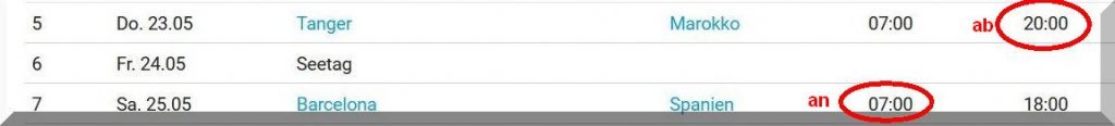 Ich habe noch nie eine Kreuzfahrt gemacht und versuche mich immer in den Rhythmus einer solchen hinein zu denken, besonders die tägliche Reisezeit. Durch die Nacht ist man unterwegs und tagsüber im Hafen auf Sightseeing Tour. An nur 2 Tagen hat man, bei dieser Kreuzfahrt, einen kompletten Tag auf See. Nun, der Sinn einer Kreuzfahrt ist es ja wohl auch, vorrangig andere Länder, Menschen und Kulturen kennen zu lernen. Bei den Fahrtenseglern dreht sich die Situation genau um – tagsüber wird gesegelt und will man die Gegend an Land erkunden, legt man einen oder mehrere Hafentage ein. Eine Kreuzfahrt will seinen Gästen natürlich möglichst viele Landausflüge in der Kürze der Reise ermöglichen ……………………….