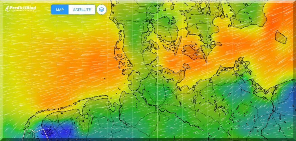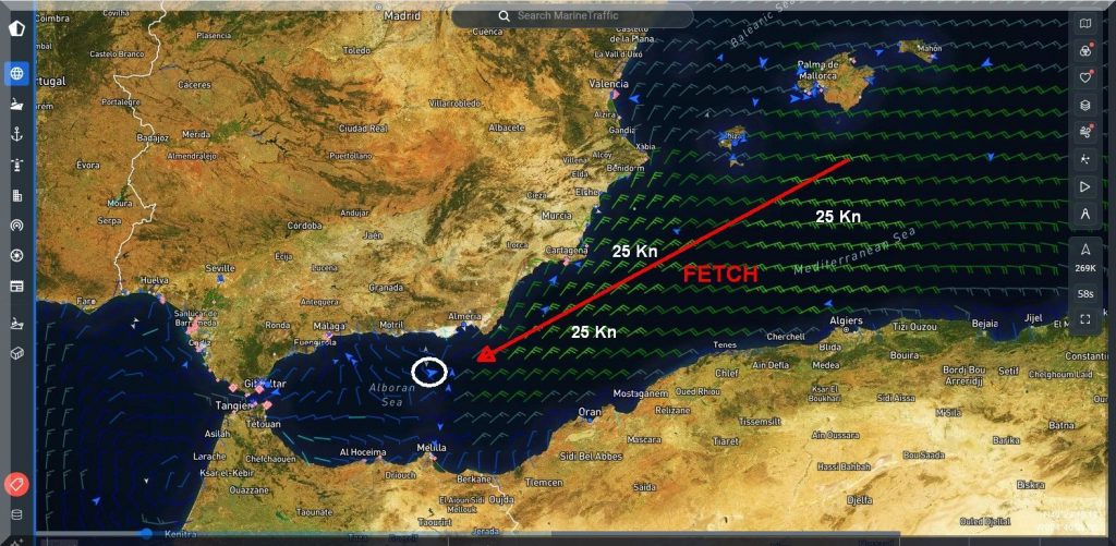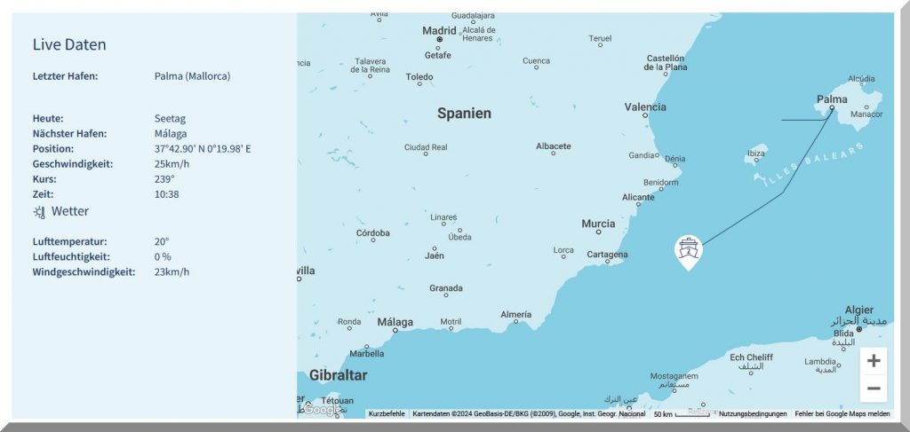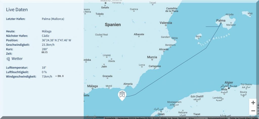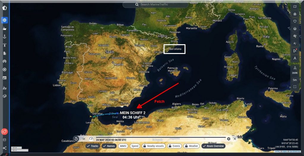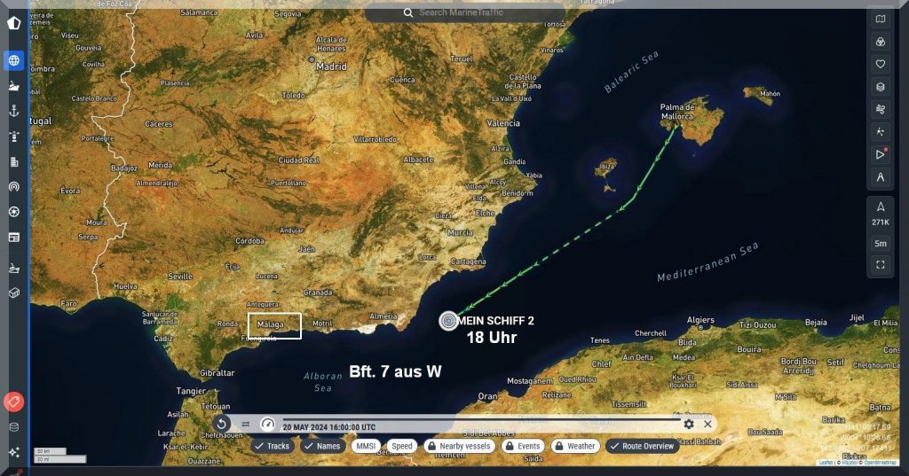 Da haben es meine Kreuzfaher um 04:36 Uhr MESZ auf dem Weg nach Barcelona in ihren Kabinen doch wie im Himmelbett, obwohl sie auch in eine Starkwindzone mit 25 Kn Wind = 6 Bft. aus NE hineinfahren, also gegenan. Aber „Mein-Schiff-2“ sollte damit spielend fertig werden. Fragt sich nur, wie seefest die Passagiere sind, denn der Fetch ist lang genug, um ordentlich Seegang aufzubauen.