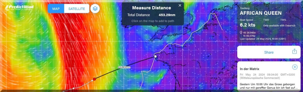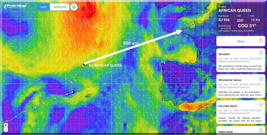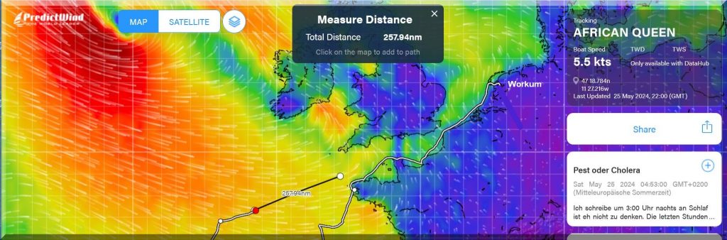 Gestern Um 10:55 Uhr das Gross geborgen und nur mit gereffter Genua bin ich fast auf Rekordetmal, ca. 144 sm. Wind und Welle haben zugenommen aber noch können wir auf einem raumen Kurs recht gut und kontrolliert Kurs 63 Grad gehen, direkt Richtung englischer Kanal. Ich hatte gestern mein Vorschott geschlossen, letztlich eine verschraubbare Holztüre mit der ich das Vorschiff trenne. Falls ich irgendwo drauf fahre, verschafft es mir Zeit. Gestern wieder Walfontänen gesehen, das war der Auslöser. Die Nacht habe ich auf dem Salonboden geschlafen, weniger Rollbewegung aber auch wenig Schlaf. Ab und an knallt mal ’ne Welle mit einem lauten Schlag seitlich gegen den Rumpf das fördert nicht gerade das rapid eye movement. Komplett abschalten kann man beim Segeln nicht, als Solo-Segler hat man immer Wache auch wenn man schläft, dementsprechend ist der Schlaf schlechter, je rauer die Bedingungen. Ich nutze teils Ohrstöpsel, die nur etwas dämpfen mich aber nicht akustisch abschotten. Die Geräusche sind beim Segeln sehr prägend und können den Puls ordentlich nach oben bringen. Daher nutzen viele Oceansegler geräuschabsorbierende Kopfhörer. Das Stressmanagment und die Erholung sind die wichtigsten Faktoren beim Einhandsegeln und ein ewiger Lernprozess. Wenn draussen der Punk abgeht und man drinnen versucht abzuschalten, zu vertrauen, alle Wenns und Abers auszublenden und zu schlafen, das gelingt mal besser, mal weniger gut.