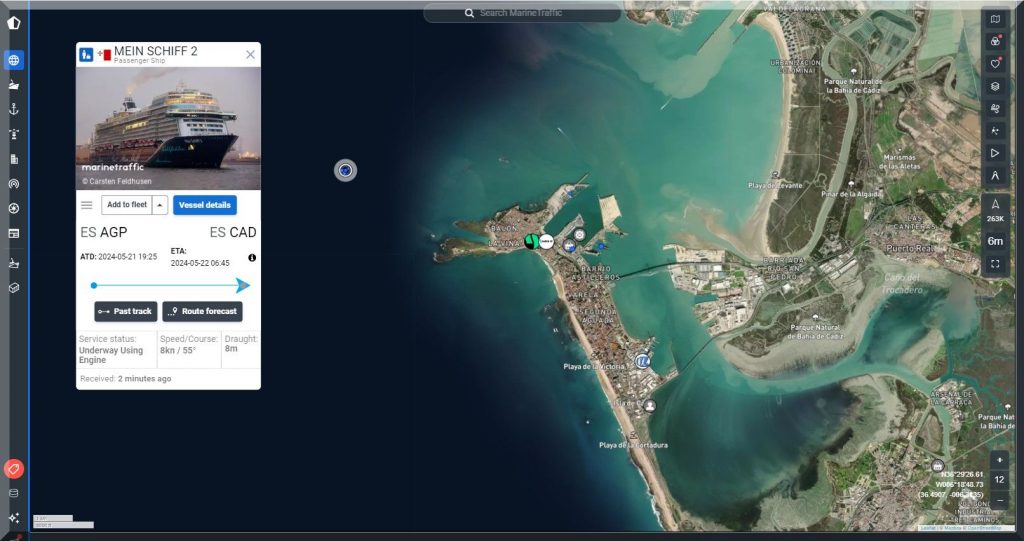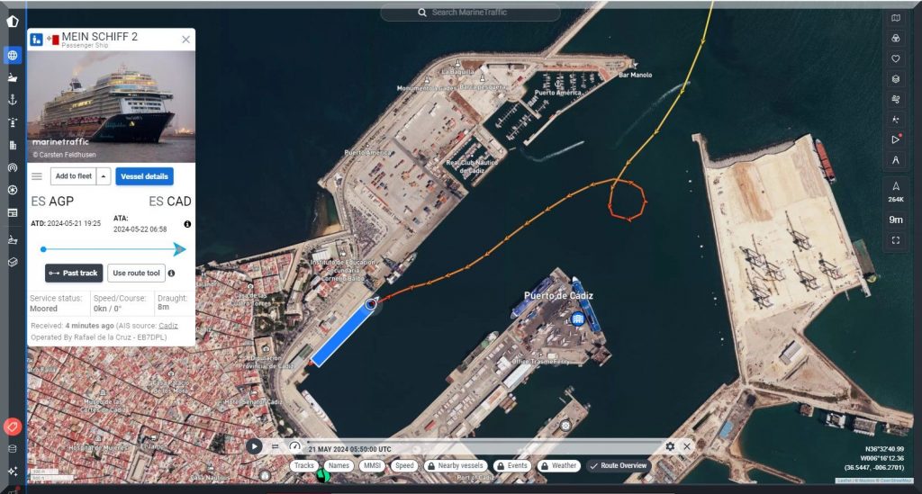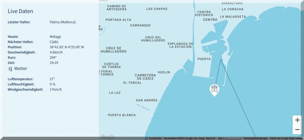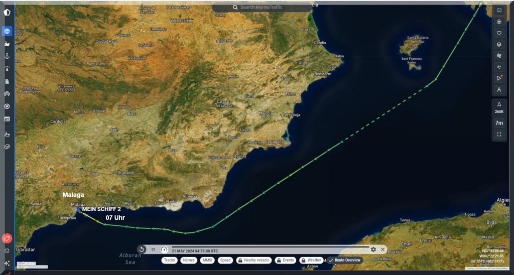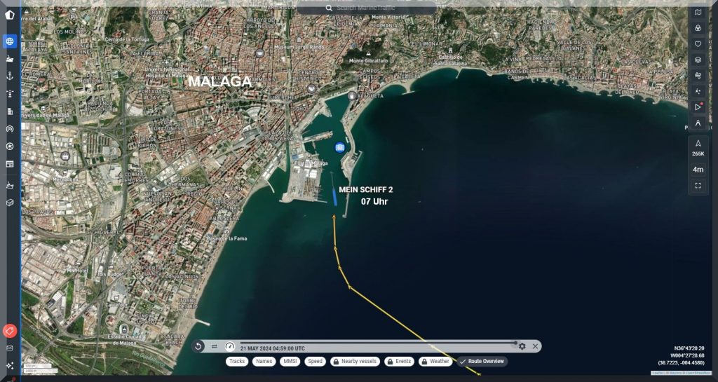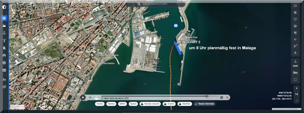 19:30 Uhr – Soeben hat das Kreuzfahrtschiff Mein-Schiff-2 den Hafen von Malaga mit Ziel Cadiz verlassen: