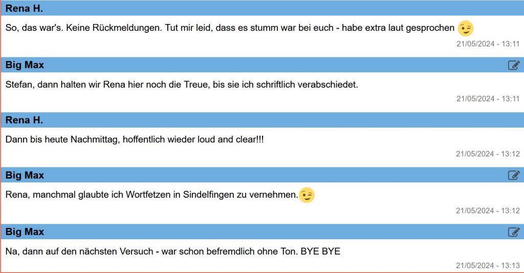 09:45 Uhr – Renas freundliche Stimme ruft uns in die: