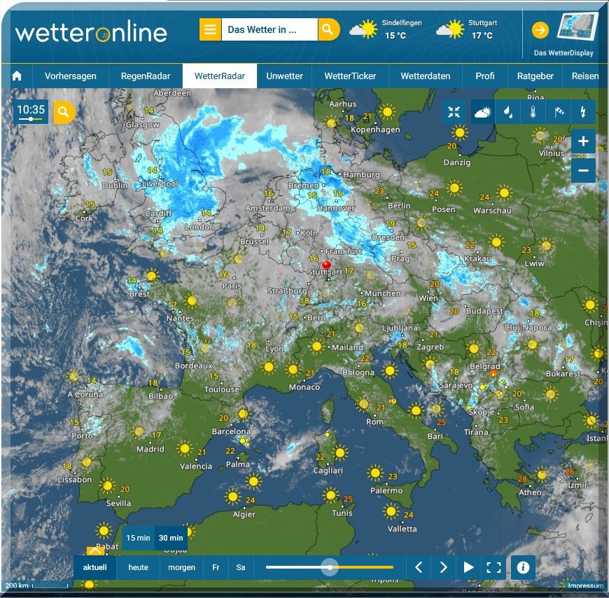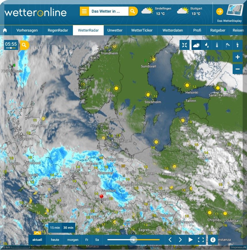 Der Tiefdruckwirbel wandert immer mehr in Richtung Irland und SW England,