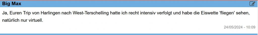 Ich finde, daß Kapitän Reiner Dietzel und seine Vertretungen schon viel mehr abdecken, als nur das Wetter. Manchmal gehen mir die Nachfragen allerdings einfach zu weit, weil sich ein Schiffsführer darum eigenverantwortlich kümmern muss. Es treiben sich schon sehr viel unbedarfte Freizeitkapitäne auf den Gewässern herum.