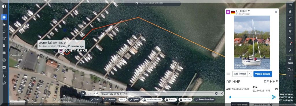 Ich suche auf MarineTraffic nach mir bekannten Schiffen ab. Am Steg 3 in Heiligenhafen zeigt die SY BOUNTY mit Kapitän Johnny an Bord ein aktives Signal, das freut mich ungemein:
