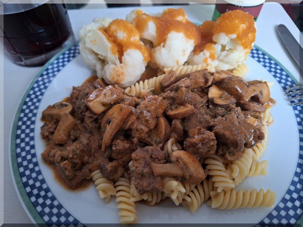Rinderhackfleisch-Haschee mit Champignons, Crème Fraîche, Petersilie, 1 Zwiebel, 1 Rinderbuillonwürfel, etwas Senf u. Tomatenmark und Blumenkohl polnisch / Gewürze: Salz, Pfeffer, Paprika, Chilli