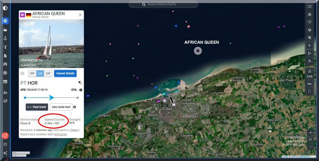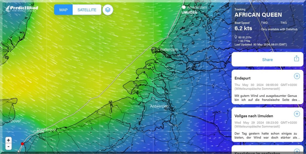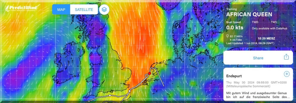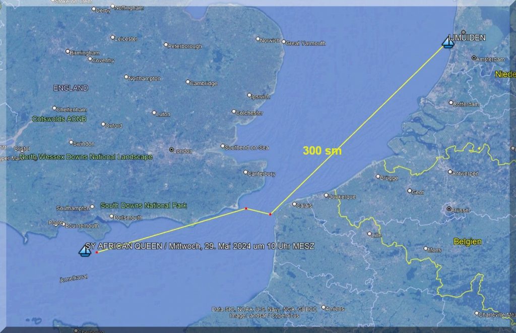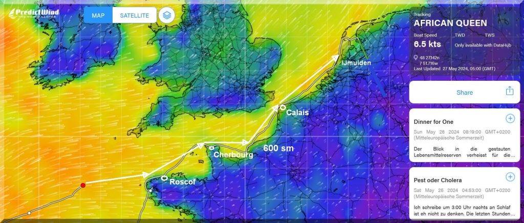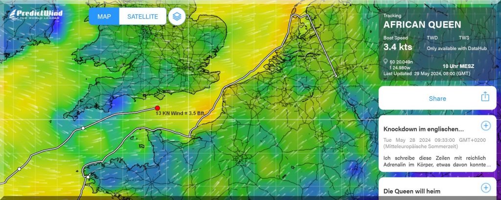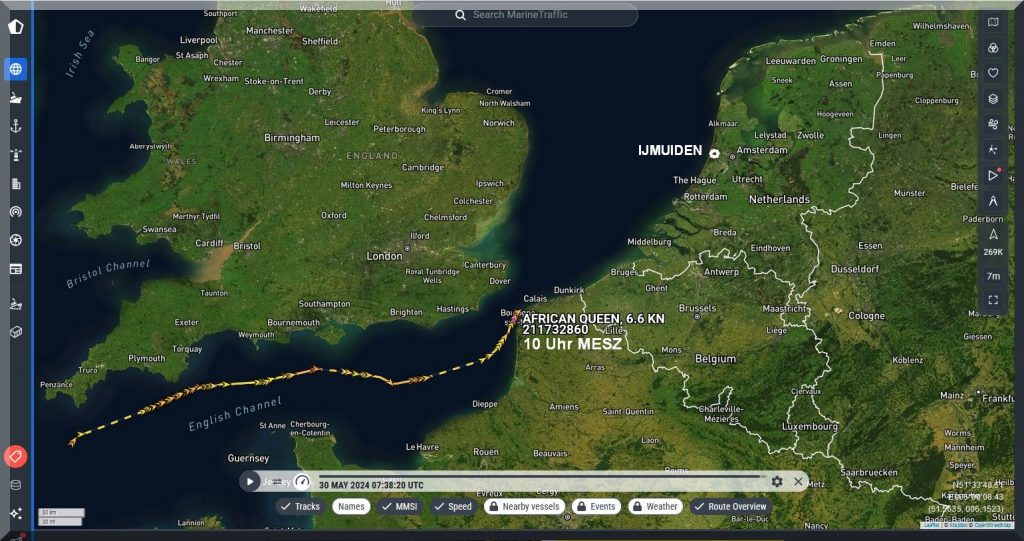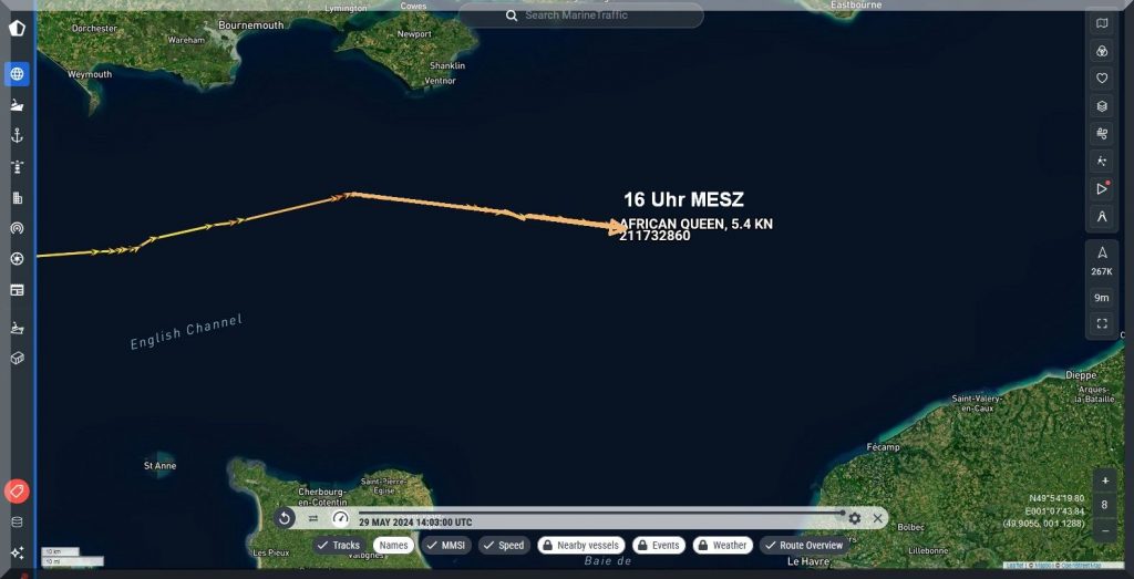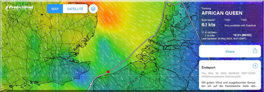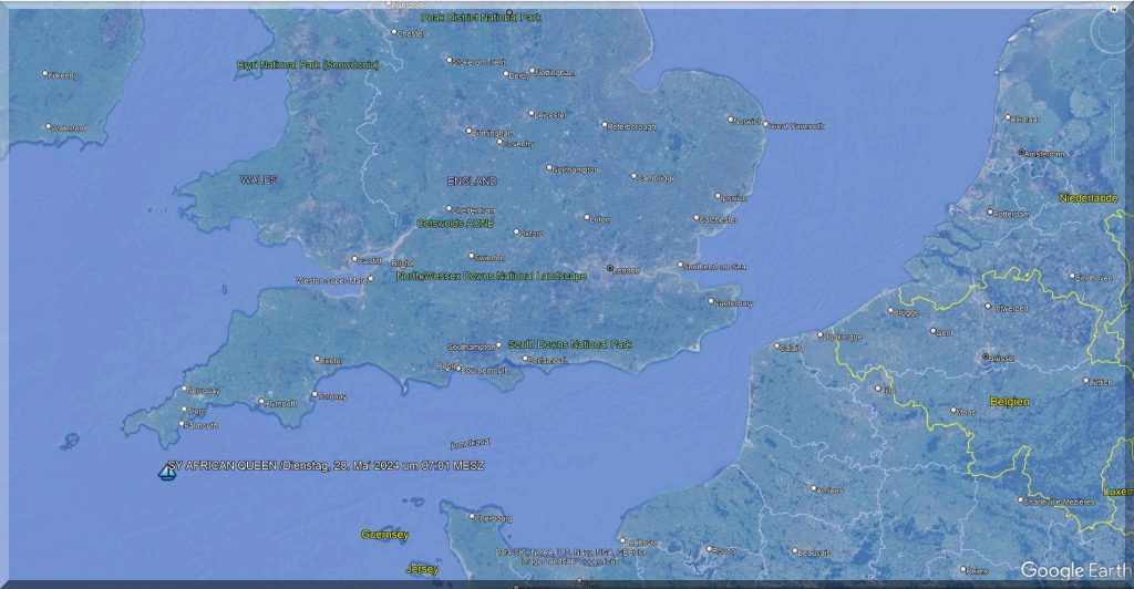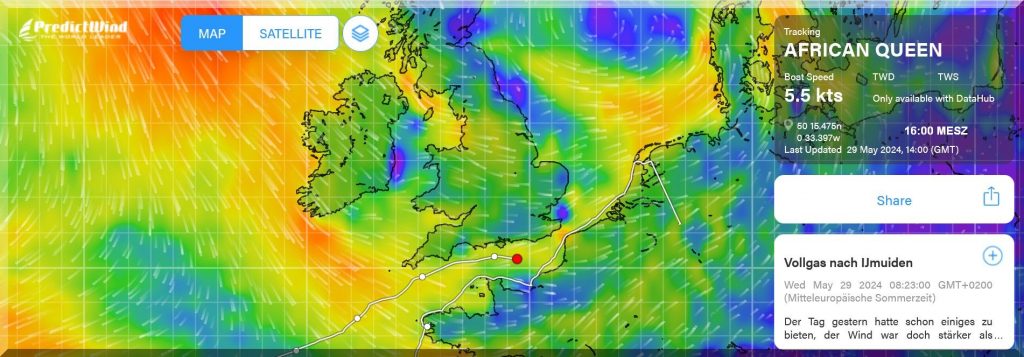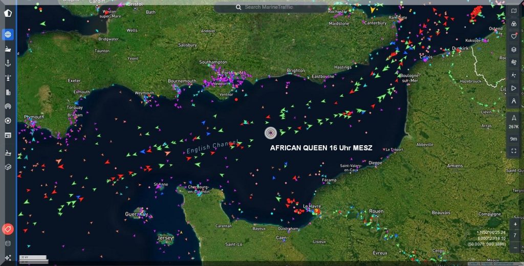 6 Uhr: Auch in der Nacht habe ich AFRICAN QUEEN mit merhmals über 7 Knoten Speed entdeckt, denn Schietwetter zog über den Ärmelkanal, das scheint sich jetz am frühen Morgen etwas zu beruhigen und die AFRICAN QUEEN macht nur noch 4 bis 5 Kn Speed. Trotzdem wird es eine sehr anstrengende Nacht gewesen sein.