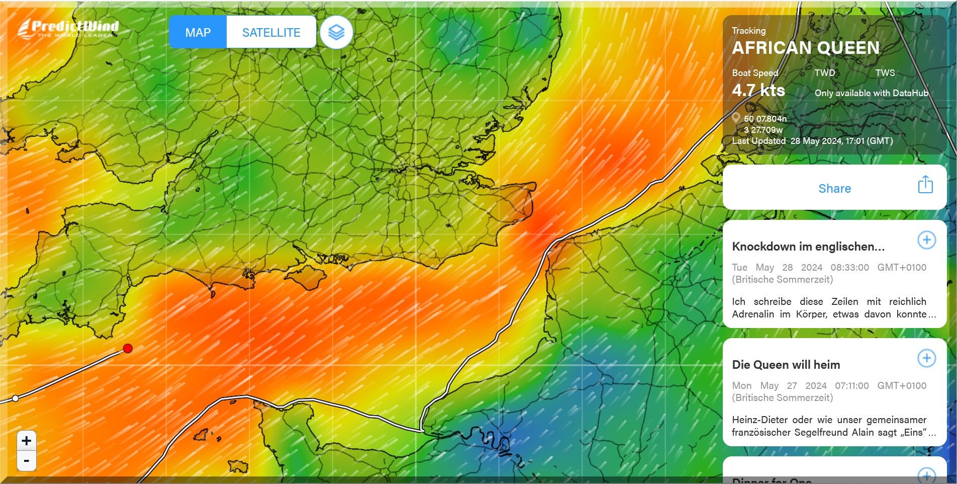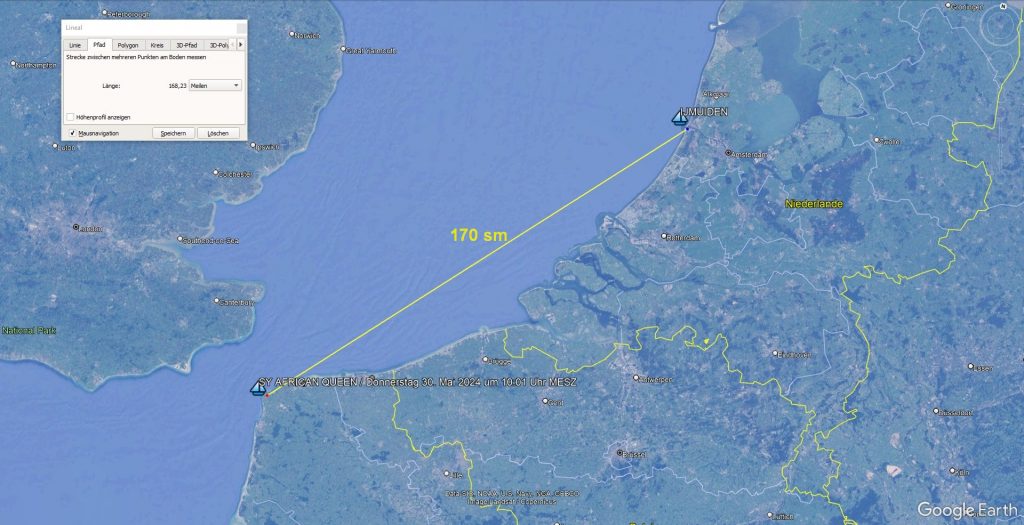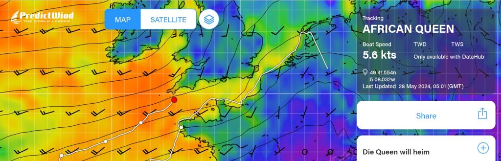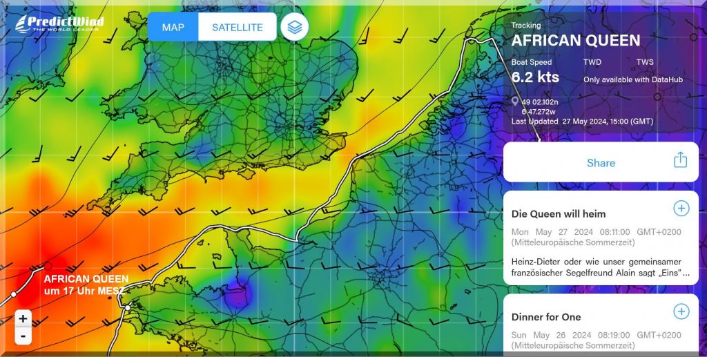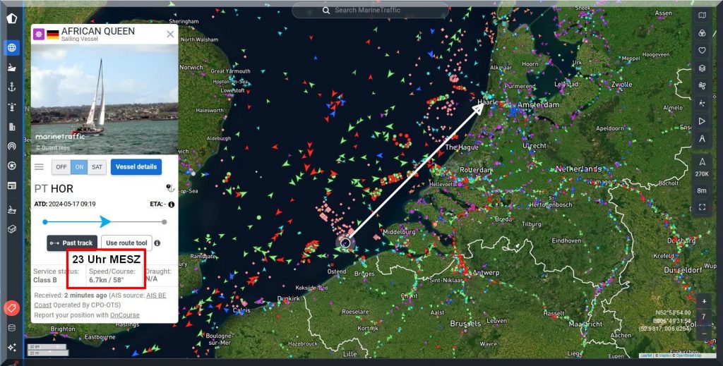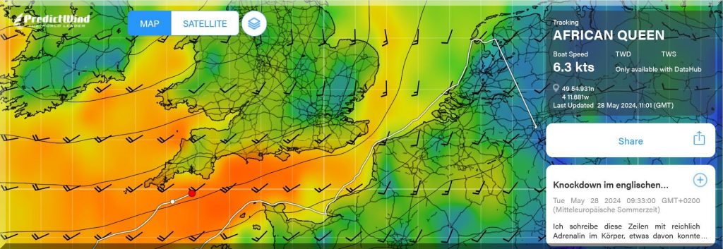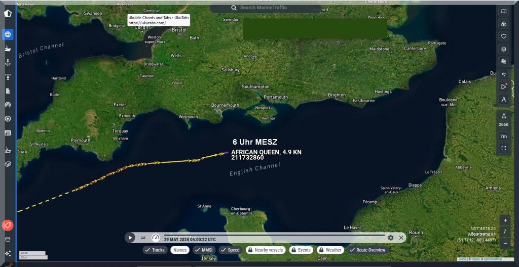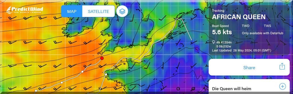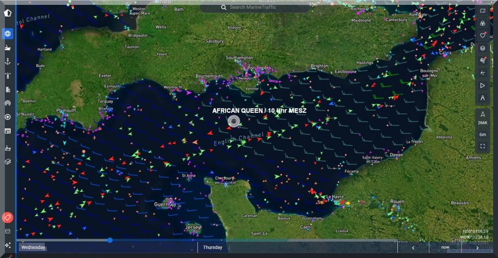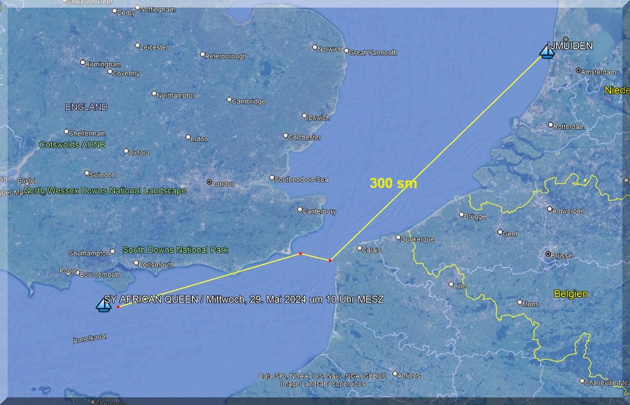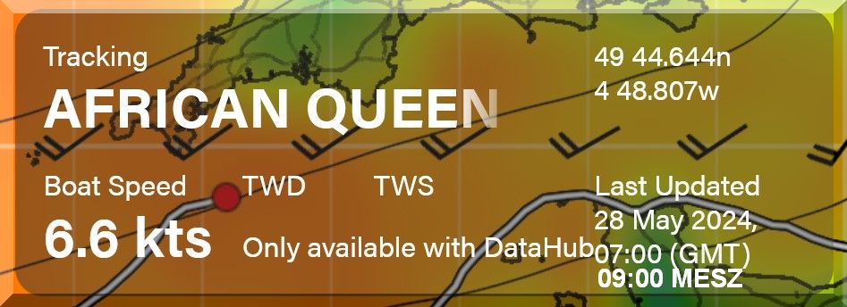 6 Uhr: Auch in der Nacht habe ich AFRICAN QUEEN mit merhmals über 7 Knoten Speed entdeckt, denn Schietwetter zog über den Ärmelkanal, das scheint sich jetz am frühen Morgen etwas zu beruhigen und die AFRICAN QUEEN macht nur noch 4 bis 5 Kn Speed. Trotzdem wird es eine sehr anstrengende Nacht gewesen sein.