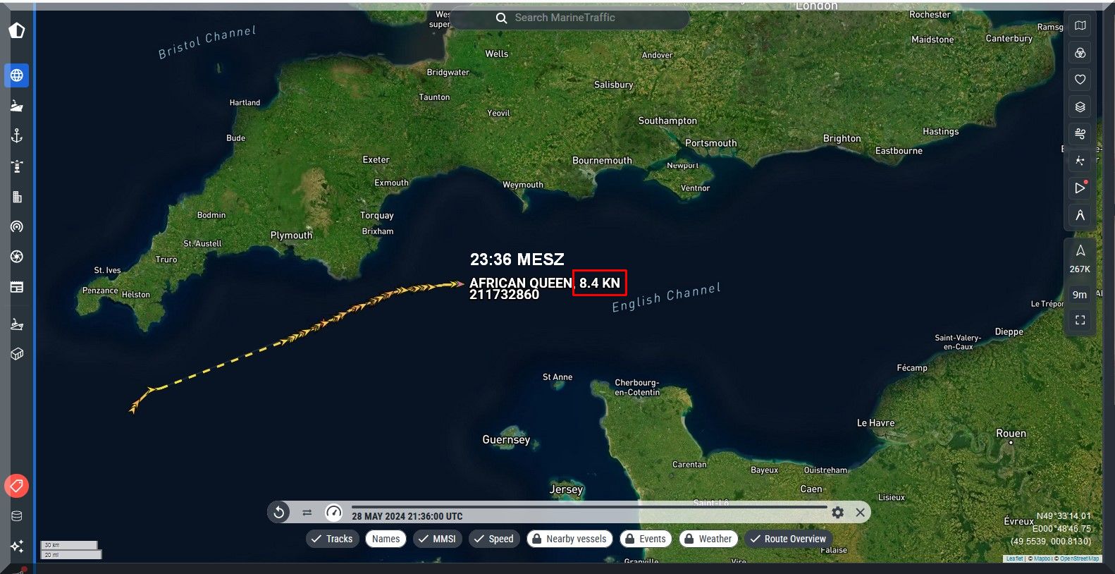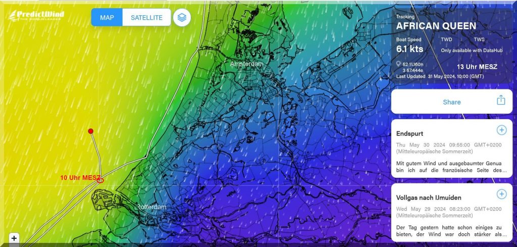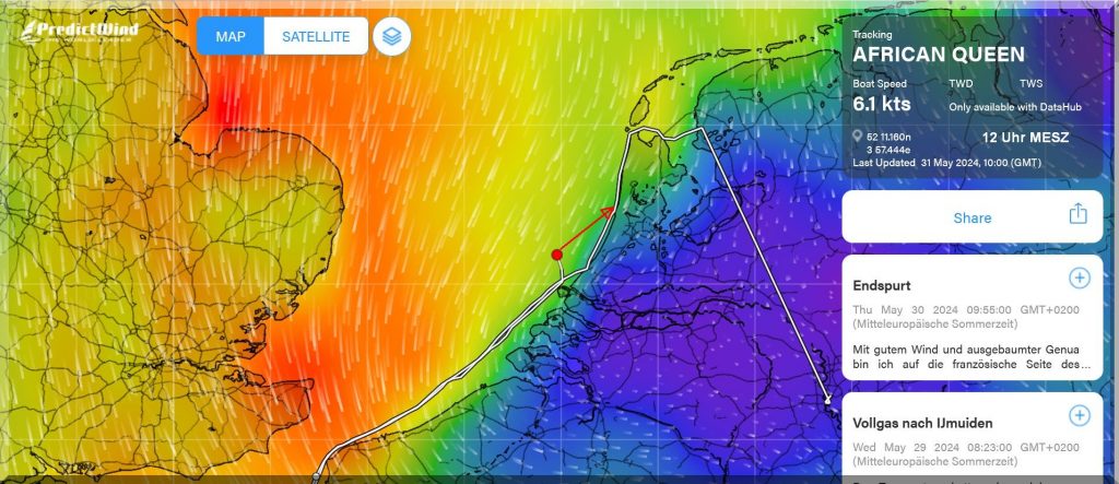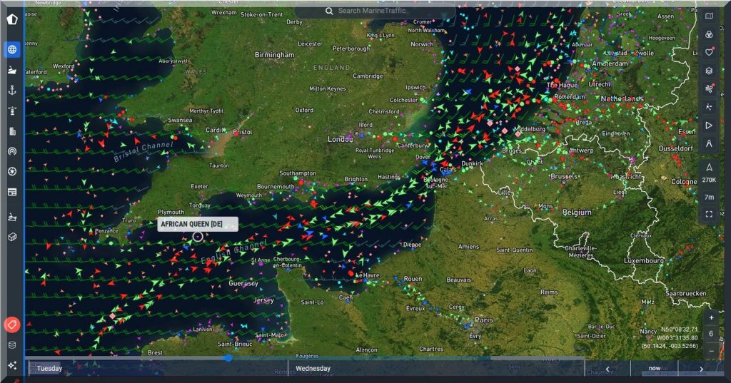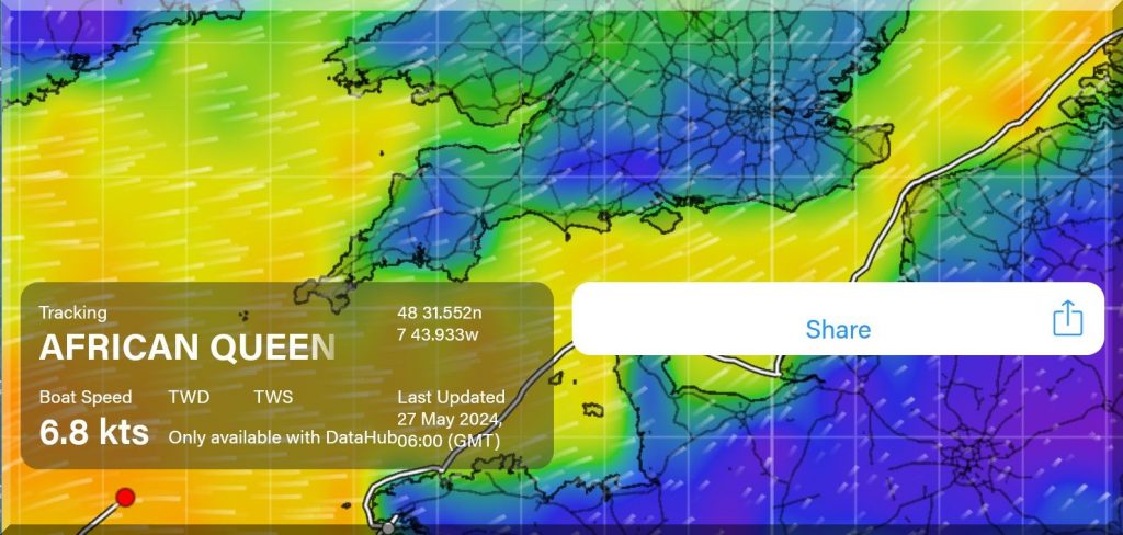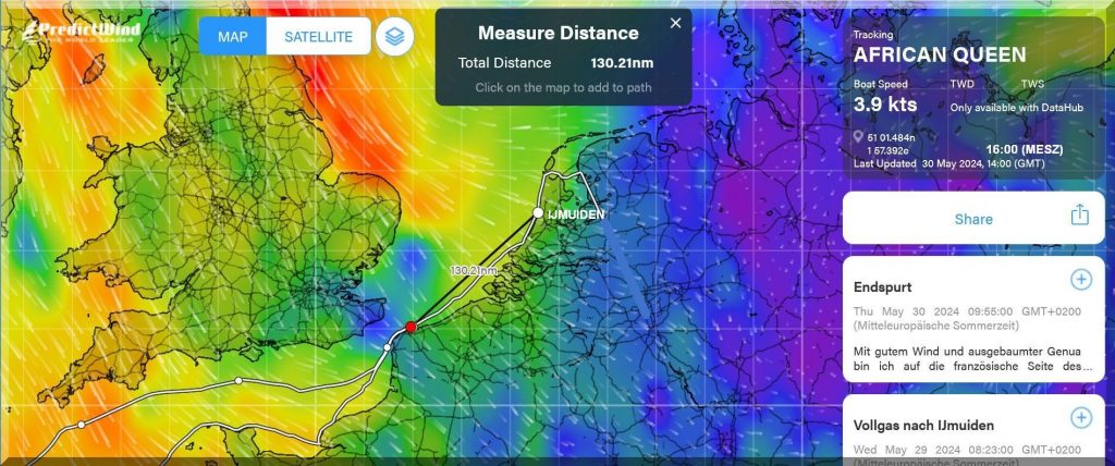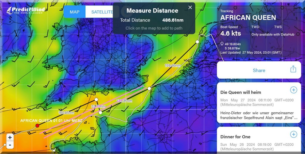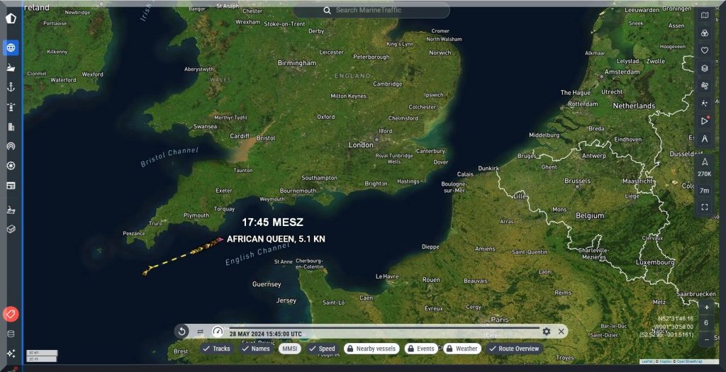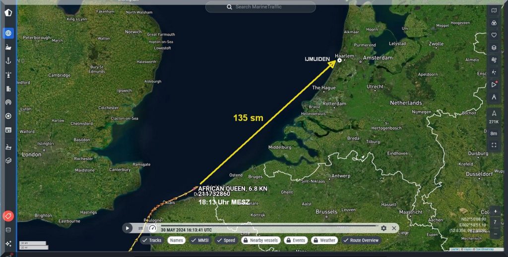 6 Uhr: Auch in der Nacht habe ich AFRICAN QUEEN mit merhmals über 7 Knoten Speed entdeckt, denn Schietwetter zog über den Ärmelkanal, das scheint sich jetz am frühen Morgen etwas zu beruhigen und die AFRICAN QUEEN macht nur noch 4 bis 5 Kn Speed. Trotzdem wird es eine sehr anstrengende Nacht gewesen sein.