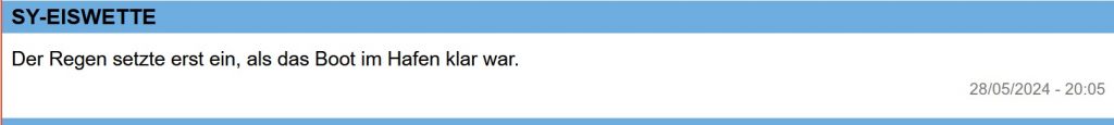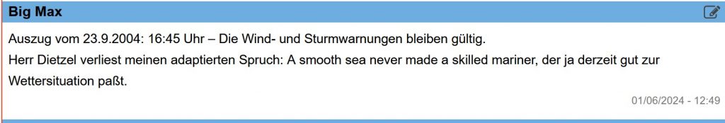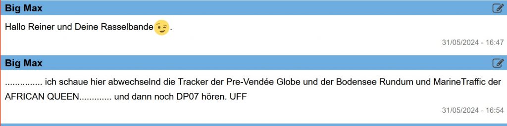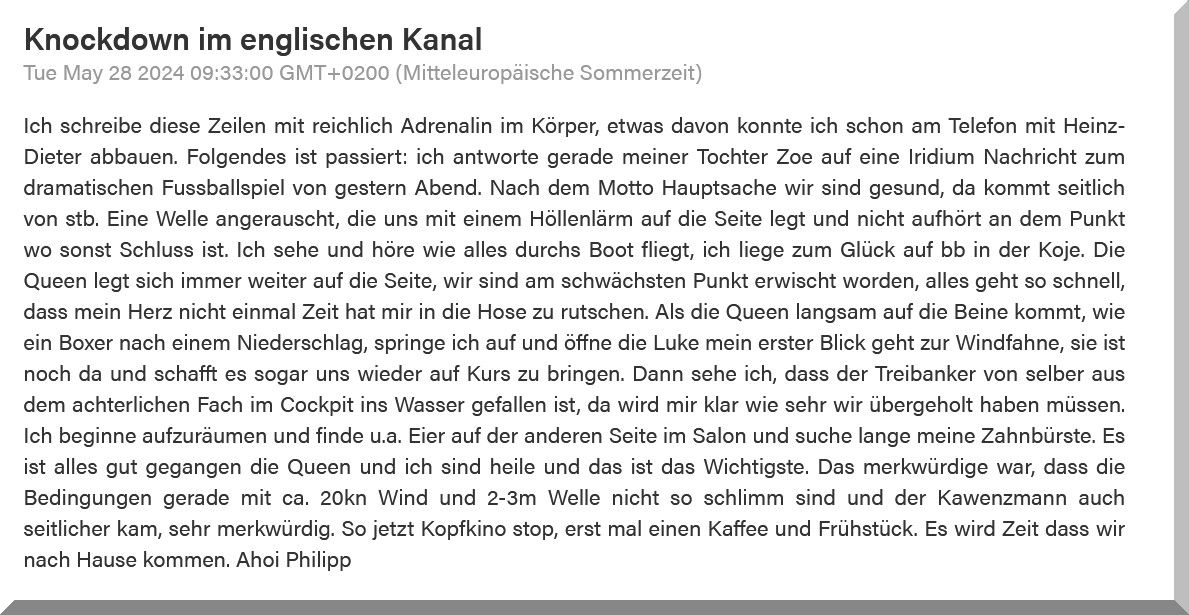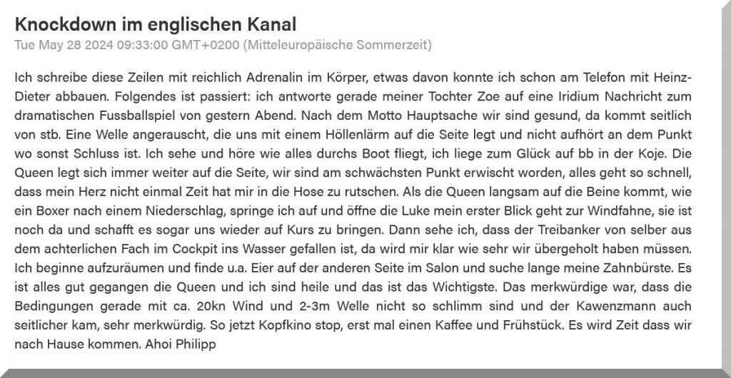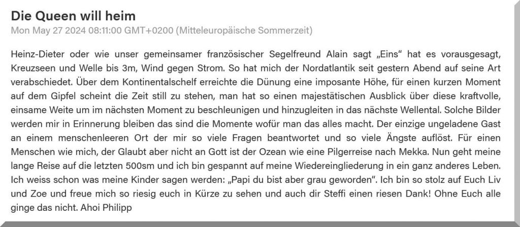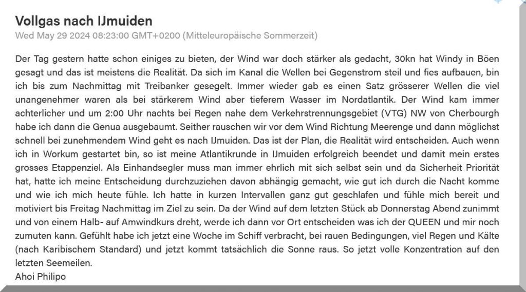 Lieber Philipp, ich konnte alles vom Schaukelstuhl miterleben. Allerdings konnte ich mich ganz gut in Deine Situationen hineindenken, denn wenn man selbst ein halbes Jarhundert gesegelt ist (25 Jahre während des Arbeitslebens und 25 Jahre als Frühpensionär), dann weiß man, wie sich ein Einhandsegler fühlt und was ihn bewegt.Deine Zukunftspläne kann ich fast schon erahnen und wünsche Dir bei der Realisierung gutes Gelingen – frei nach dem Sinnspruch: ALLES DARF, NICHTS MUSS: