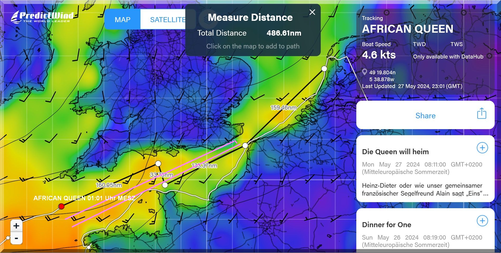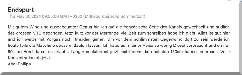 ich reise ja virtuell mit Dir mit und sehe Dich gerade im Schwachwind vor Calais. Gib Dir einen Ruck und laufe ein.