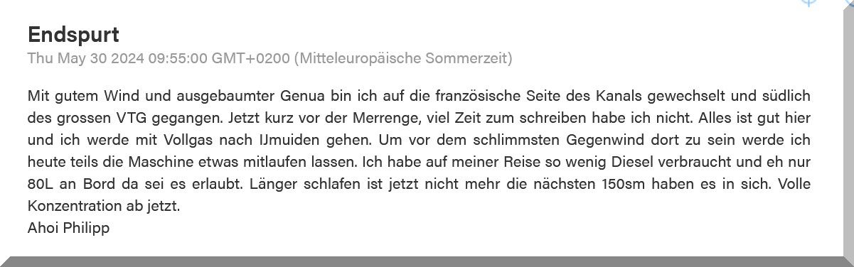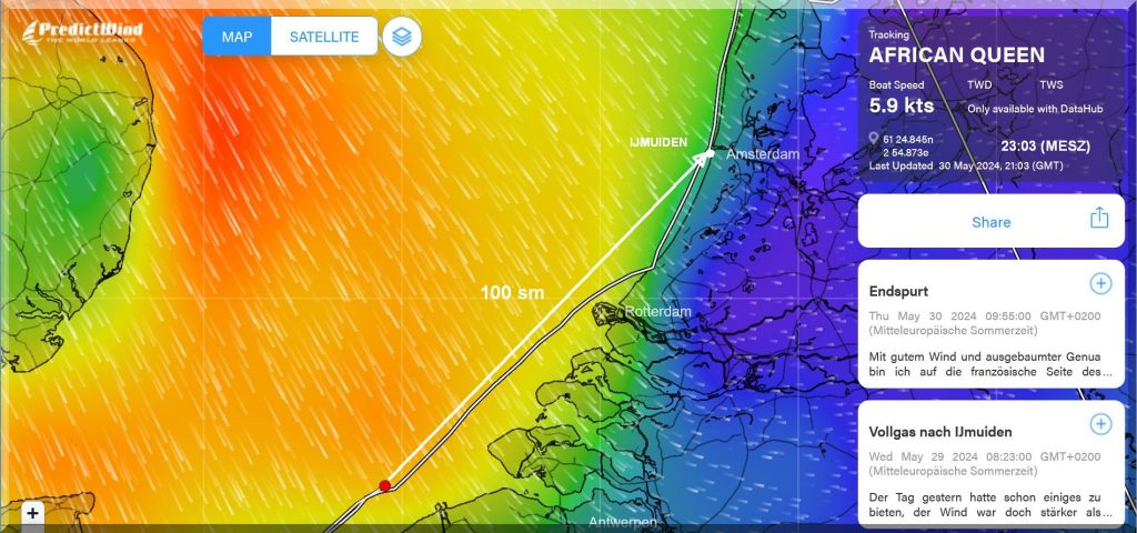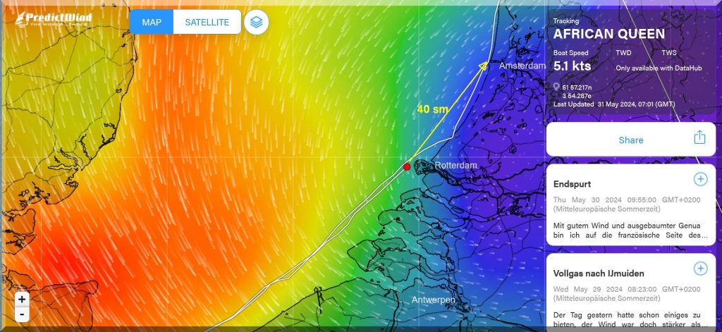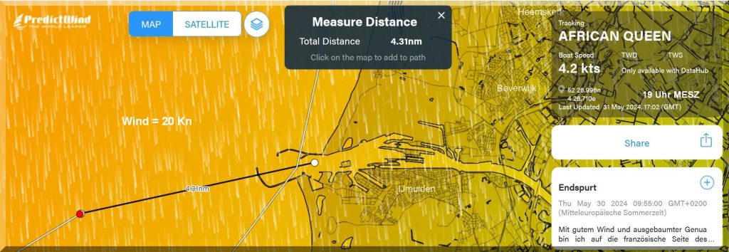 Philipp wird es in 2 h geschafft haben, verraten mir meine Tracking Tools. Er segelt z.Z. mit 3.8 Kn Speed sehr hoch am Nordwind der Stärke 5 Bft.