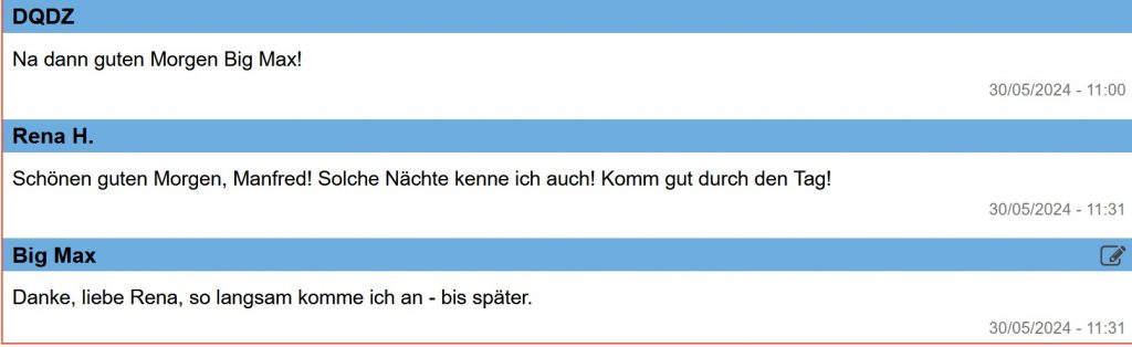 Mitten in der dunklen Nacht bekomme ich einen Funkspruch einer anderen 36ft Yacht SHAMAN mit niederländischer Profiskipperin und wir hatten einen netten Plausch und sie zollte mir tiefsten Respekt auf 30ft alleine bei den Bedingungen.