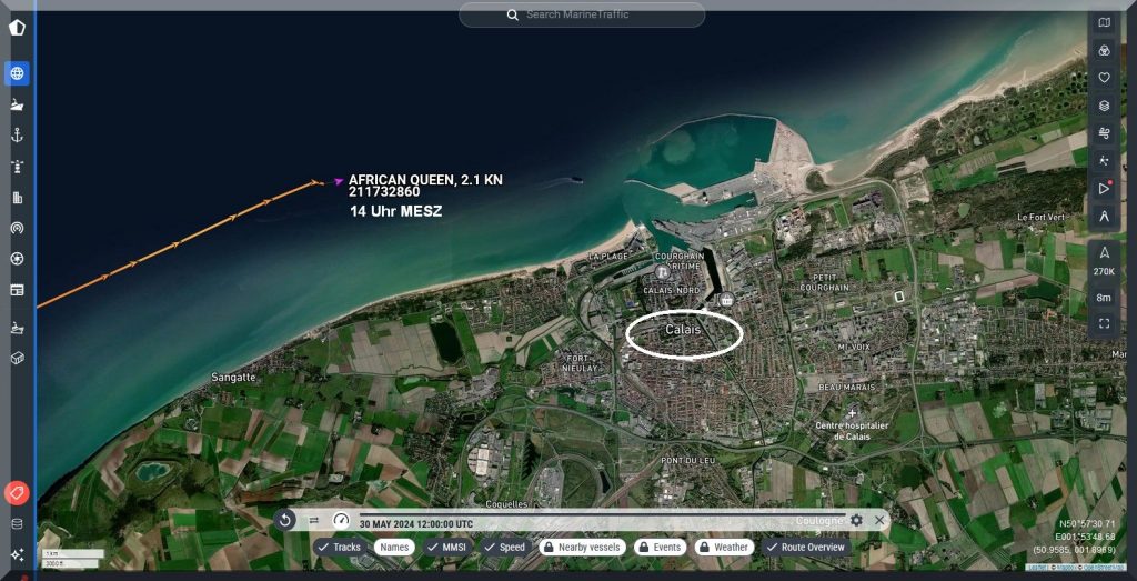14 Uhr – Phillipp ist ganz dicht vor dem Hafen von Calais, mit wenig Geschwindigkeit. Wird er schwach werden? Ich rate es ihm, eine schöpferische Pause einzulegen. Philipp, Du hast doch alle Zeit der Welt, sei vernünftig und setzte Dir keine unnötigen Ziele.