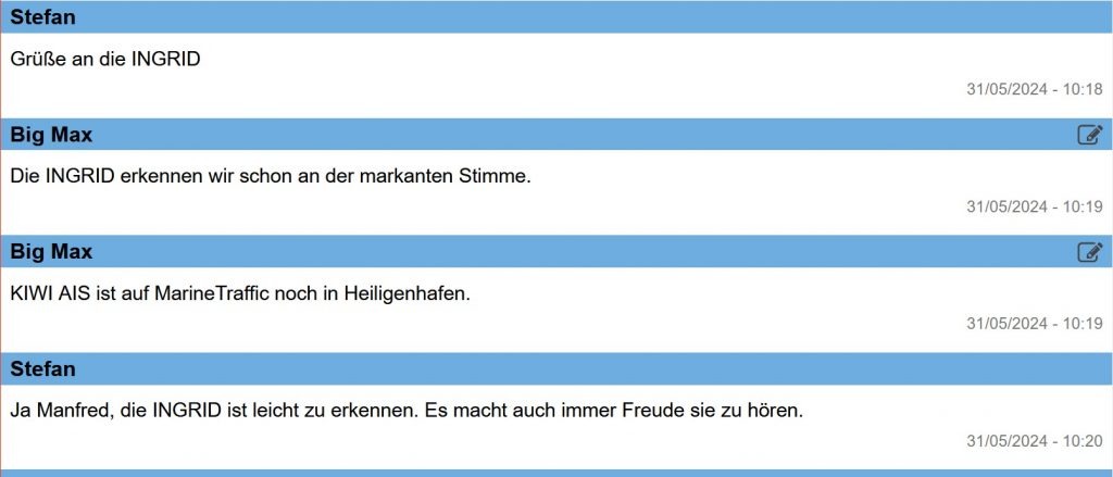 Lieber Manni, danke für Deine Wünsche! Wir haben kein AIS an Bord. Ein altes gepflegtes Schiff der Knurrhahn H&R 31″ von 1990 – wir melden uns über Delta Papa – bleibe lotrecht mit der Nase im Wind !