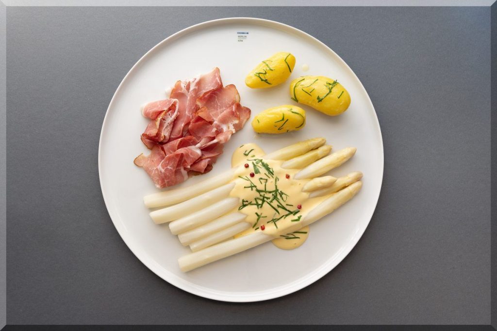 17:20 Uhr – Zum Abendessen gab es Spargel klassisch mit Sauce Hollandaise, feinem Schwarzwälder Schinken und Pellkartoffeln: