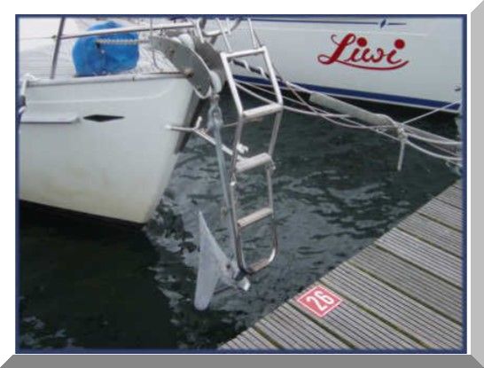 So bin ich bei Hochwasser immer auf Waltzing Matilda gestiegen – neben mir die SY LiWi am Steg 3 in Heiligenhafen.