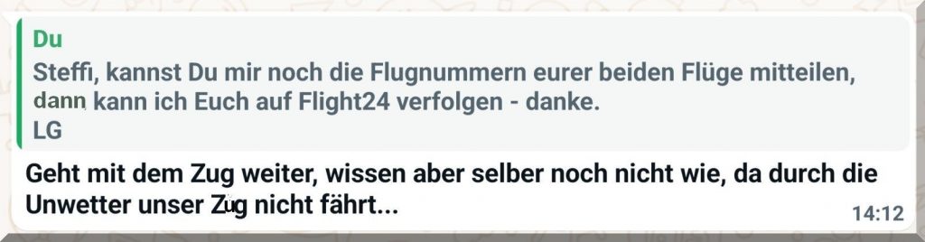 Das gab mir Anlaß, meine Tochter per WhatsApp um die Flugnummern ihrer beiden Heimflüge zu bitten. Mal sehen, ob es noch klappt.