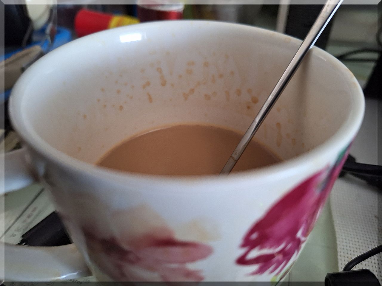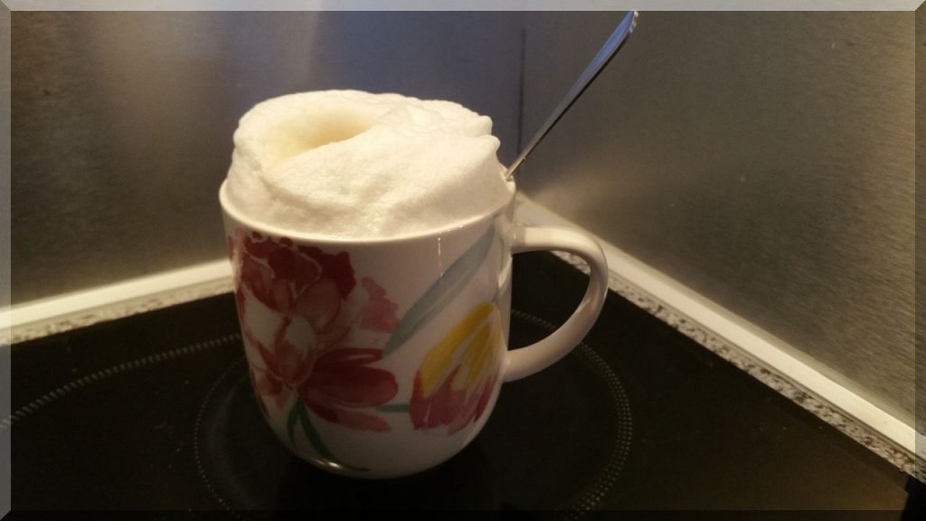 11:30 Uhr – Soeben habe ich mir einen Mug Druckkannen-Espresso mit geschäumter Milch zubereitet.