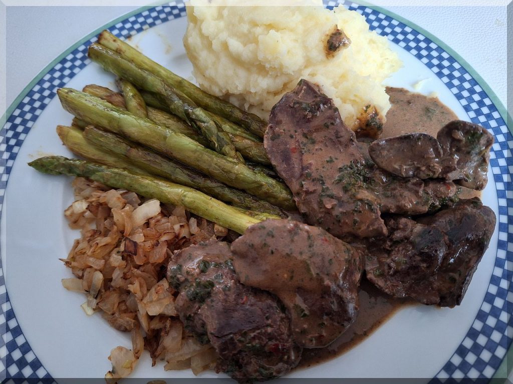 17:30 Uhr Abendessen: Frische Hühnerleber mit gebratenen Zwiebelwürfeln / in Butter gebratenem grünen Spargel / Sättigungsbeilage Kartoffelpüree