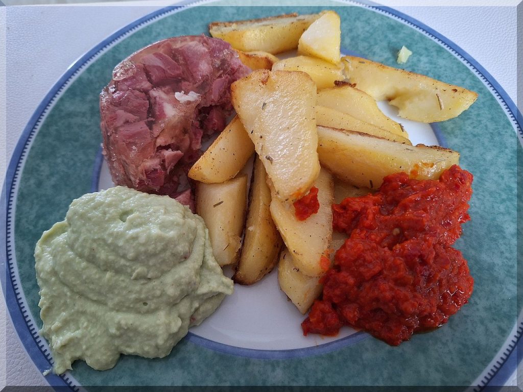 18 Uhr – Abendessen: Dreistein Sauerfleisch mit Kartoffel-Wedges, Avocado-Limetten-Dipp u. Ajvar
