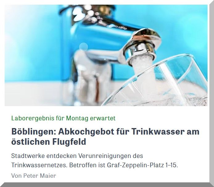 Böblingen. Bei den regelmäßig und engmaschig durchgeführten Netzbeprobungen durch die Wasserabteilung der Stadtwerke Böblingen sind bei einer von zwei Proben im östlichen Bereich des Flugfeldes Verunreinigungen des Trinkwassernetzes durch Enterokokken nachgewiesen worden, das heißt die in der Trinkwasserversorgung vorgegebenen Grenzwerte wurden überschritten. Eine Verunreinigung mit Enterokokken kann zu einer Gesundheitsgefährdung führen.