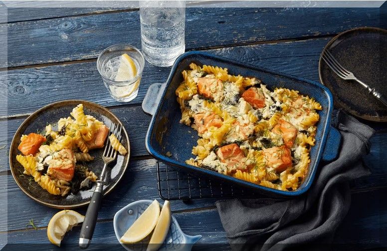 17:30 Uhr – Abendessen: Nudelauflauf mit Blattspinat, Lachsschnitte und mit etwas Käse überbacken.