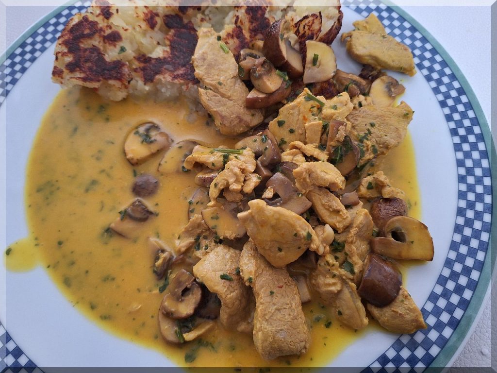 17:30 Uhr – Jetzt machen wir uns über die Zubereitung des Abendessens her. Es wird Schweinefilet-Geschnetzeltes mit Rahmchampignons in Safransauce und Rösti geben:
