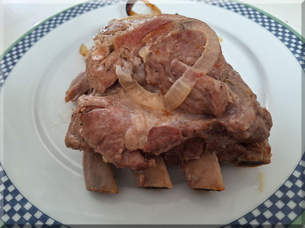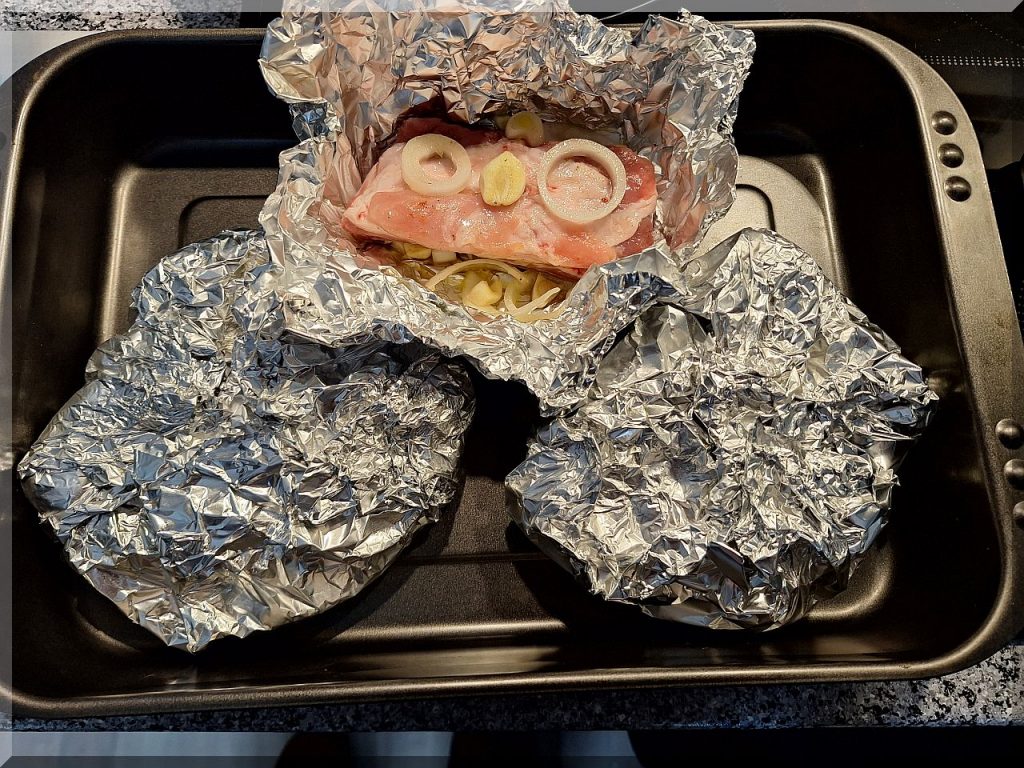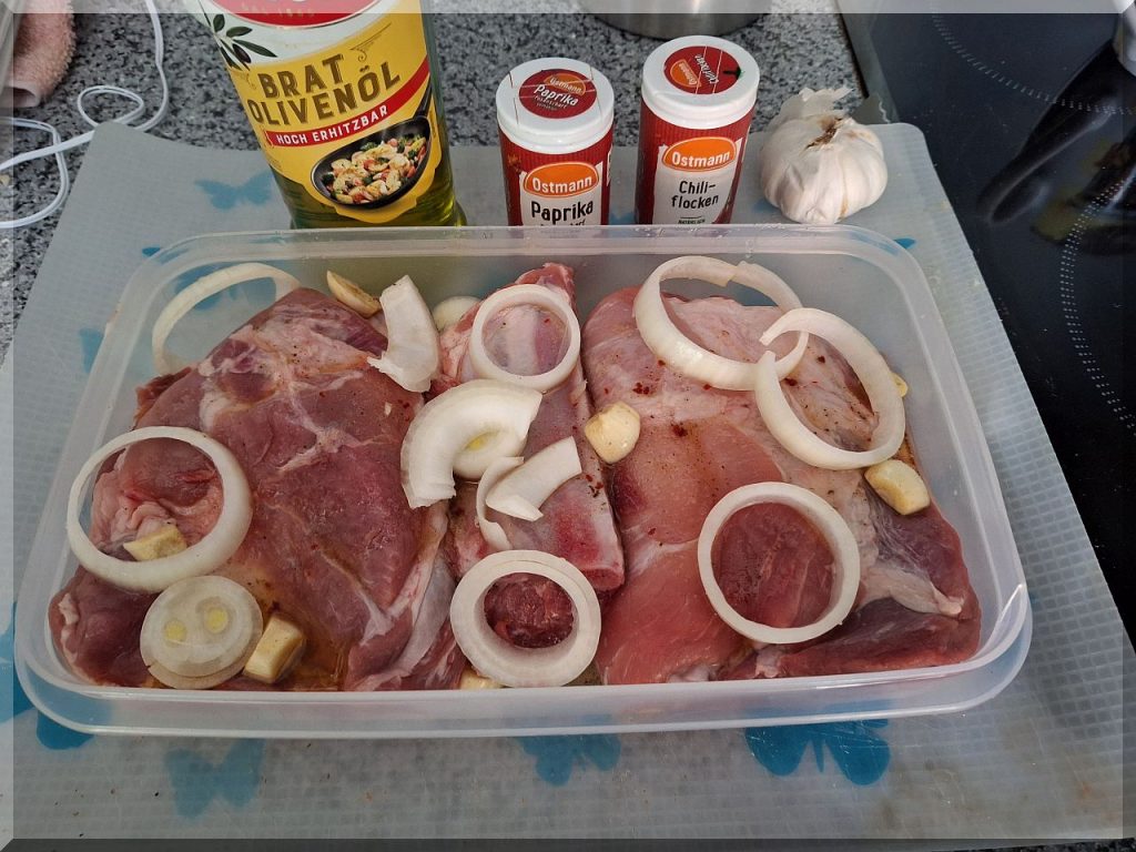 12 Uhr – Marianne zeigt mir die vorbereiteten dicken Rippchen, die es zum Abendessen geben wird. Um 15 Uhr kommen sie dann noch in Alufolie für 2,5 h in den Backofen.