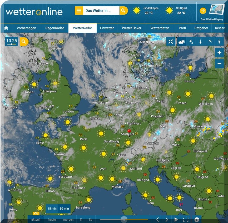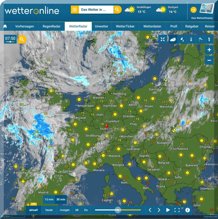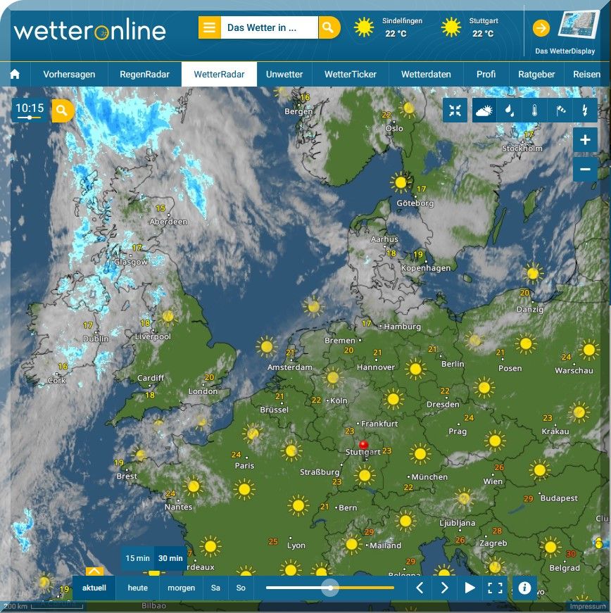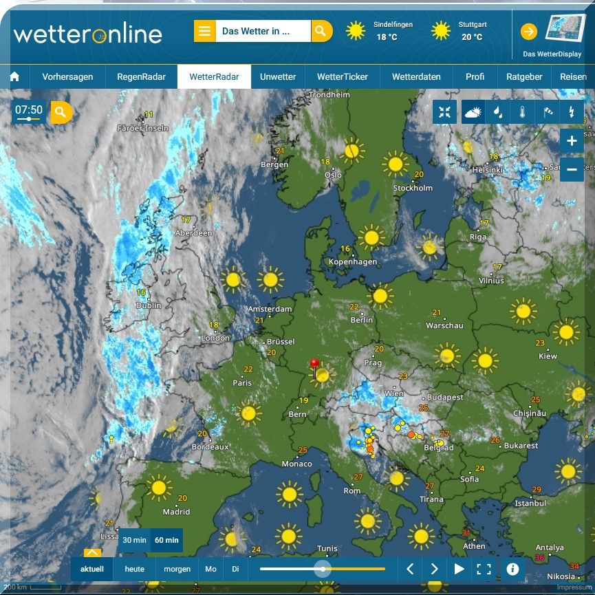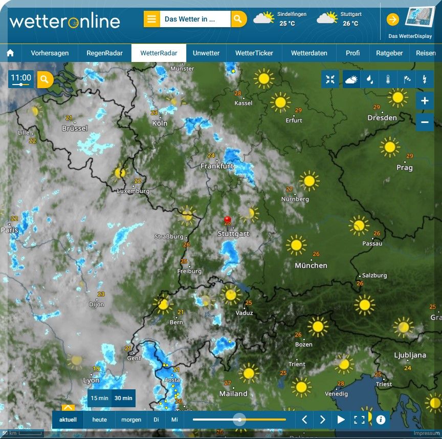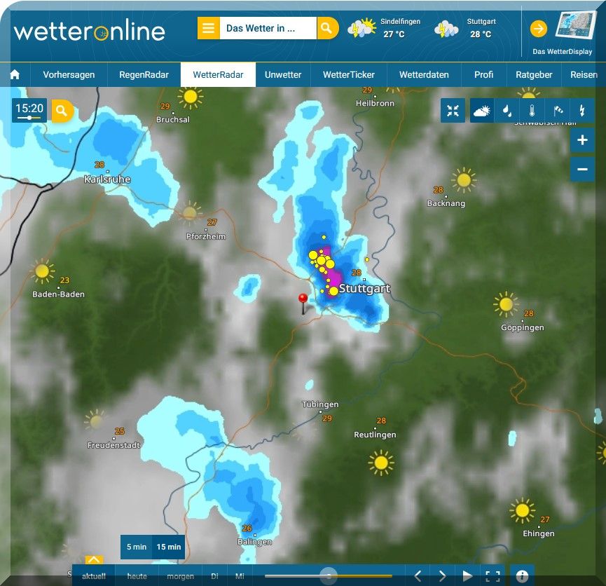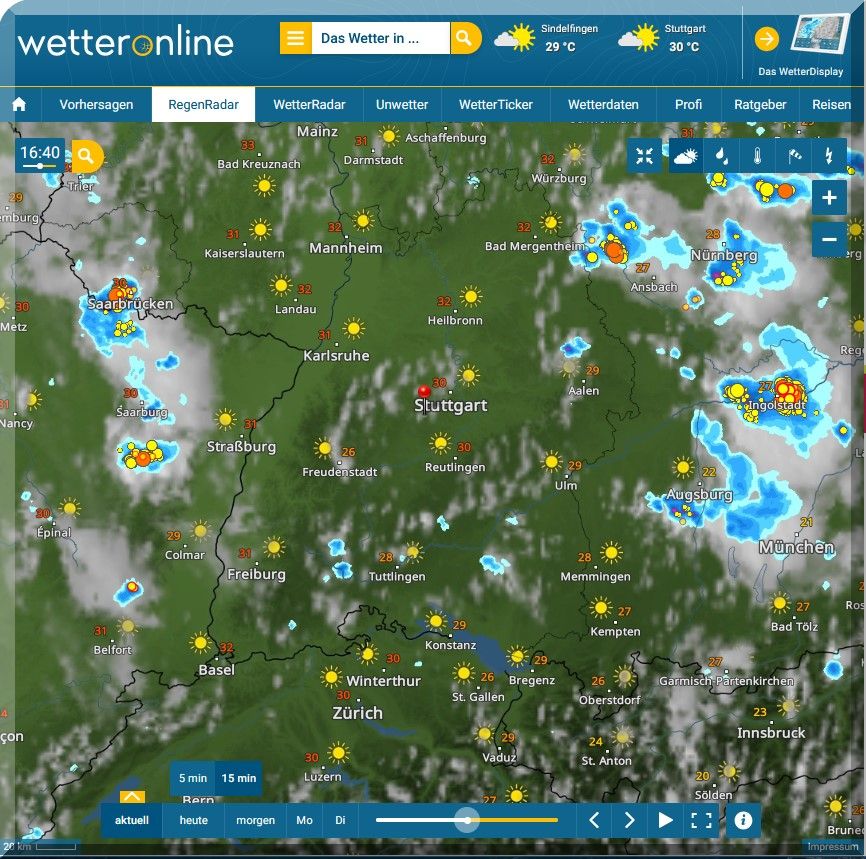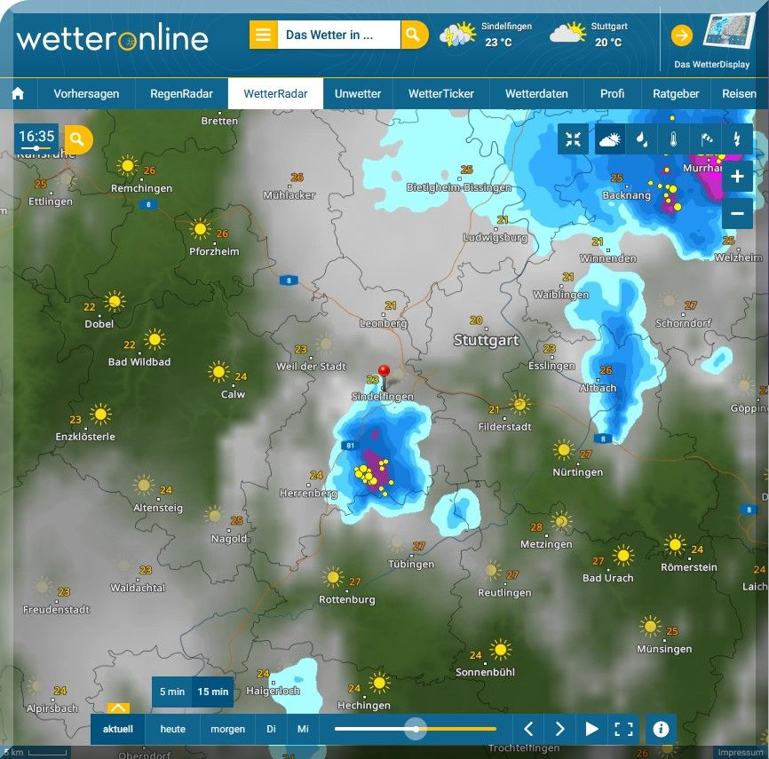 16:40 Uhr – Sindelfingen 29 °C und vereinzelt kleine Gewitterzellen in der weiträumigen Umgebung: