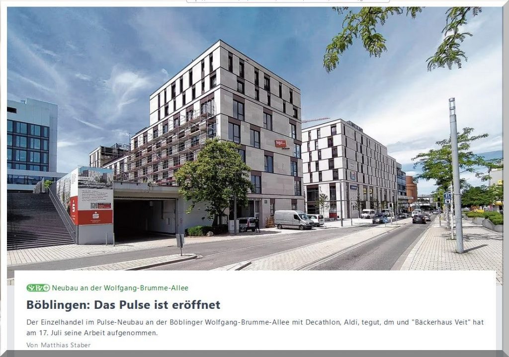 Böblingen. Im Neubau Pulse an der Böblinger Wolfgang-Brumme-Allee auf dem Areal des ehemaligen City-Centers haben der Geschäftsführer des Bauträgers Böblinger Baugesellschaft (BBG) Rainer Ganske und Oberbürgermeister Dr. Stefan Belz die Eröffnung des Einzelhandels gefeiert: Seit Mittwochmorgen haben der Sportartikelhändler Decathlon, der Discounter Aldi, der Lebensmittelvollsortimenter tegut, der Drogeriemarkt dm und das „Bäckerhaus Veit“ mit Café und Außenfläche für die Kunden geöffnet.