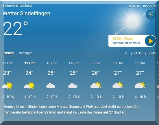 In den nächsten Tagen gibt es in Sindelfingen einen Mix aus Sonne und Wolken. Dabei muss morgen mit vereinzelten Gewittern gerechnet werden. Auch am Montag fällt Regen. Es wird kälter: Die Höchstwerte sinken von 28 Grad heute auf 24 Grad morgen.