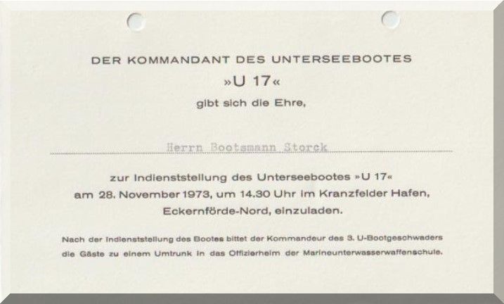 U17  in Sinsheim – mein Trauzeuge Helmuth Storck – wie ich Sonar Operateur –  er fuhr im 3. UG ab Indienststellung – ich fuhr 4 Jahre früher im 1. UG in Kiel U2, U9 und U11 alle Typ 205a  –  U2 verschrottet, U9 liegt in Speyer. U11 steht an Land in Burgstaaken  –  U17 ist Typ 206a, nun zur letzten Ruhe in Sinsheim.