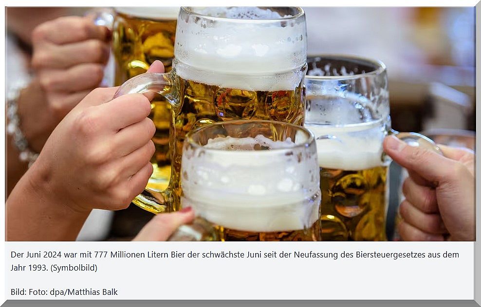 Der Bierdurst in Deutschland ist im ersten Halbjahr 2024 weiter zurückgegangen. Die Brauereien haben insgesamt 4,2 Milliarden Liter des alkoholhaltigen Getränks abgesetzt, wie das Statistische Bundesamt berichtet. Das waren 0,6 Prozent weniger als im gleichen Vorjahreszeitraum. Im Inland wurde mit 3,4 Milliarden Litern eine um 0,9 Prozent niedrigere Menge als im Vorjahr abgesetzt.