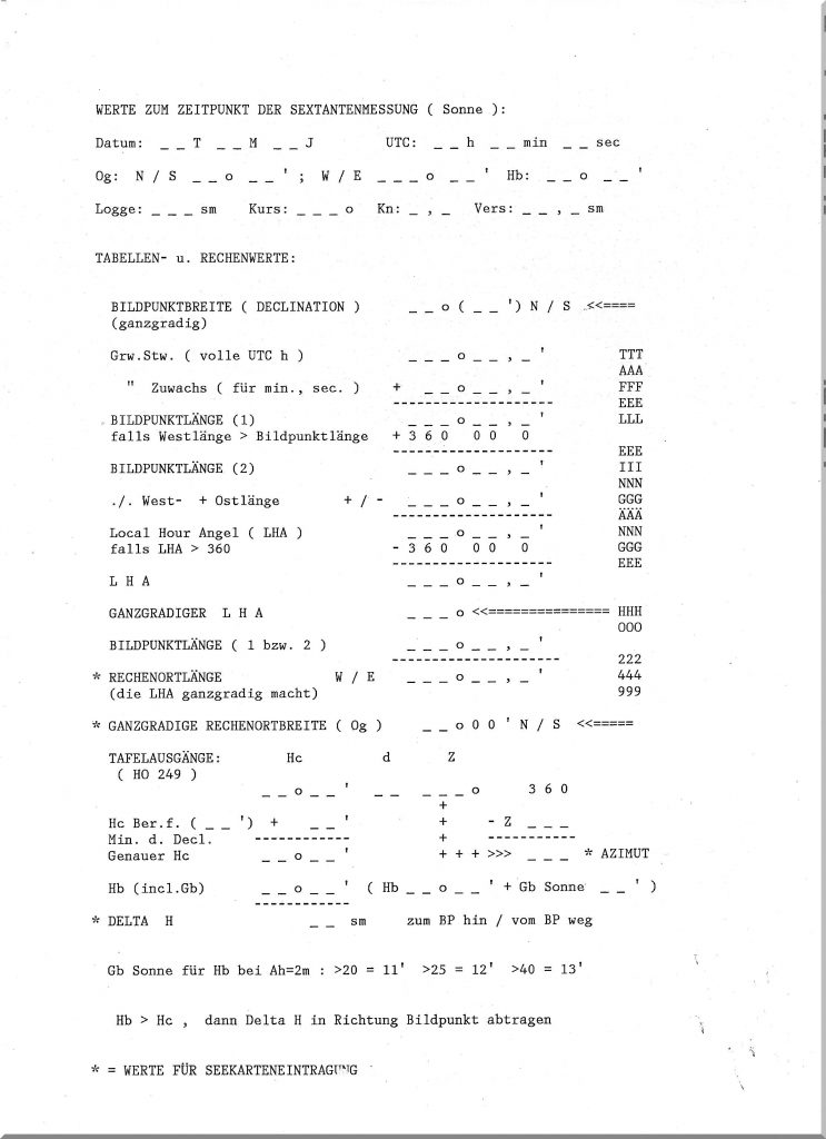 Fast jeder Astronavigator legt sich ein Formblatt an, um die entsprechenden Meßwerte und Tafelwerte einzutragen, um letztlich den wahren Ort zu bestimmen. Wenn man sich hierbei nicht stark konzentriert, schleichen sich sofort Ergebnisfehler ein, aber man gewöhnt sich daran, präziese zu arbeiten.