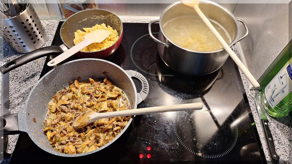 18 Uhr – Marianne war im Breuningerland und hat frische Pfifferlinge mitgebracht, die wir uns zum Abendessen zubereiten – Marianne mit Nudeln und ich mit Rührei: