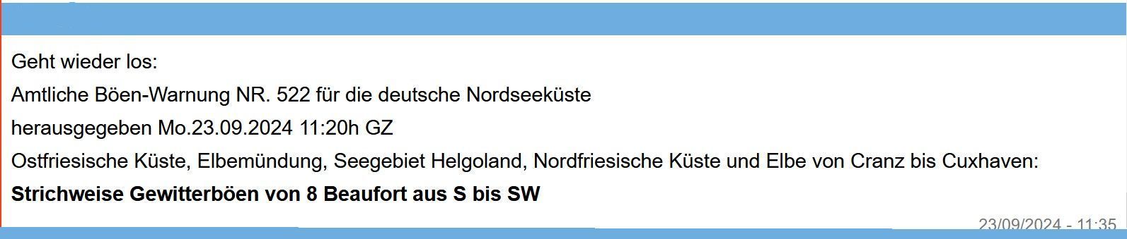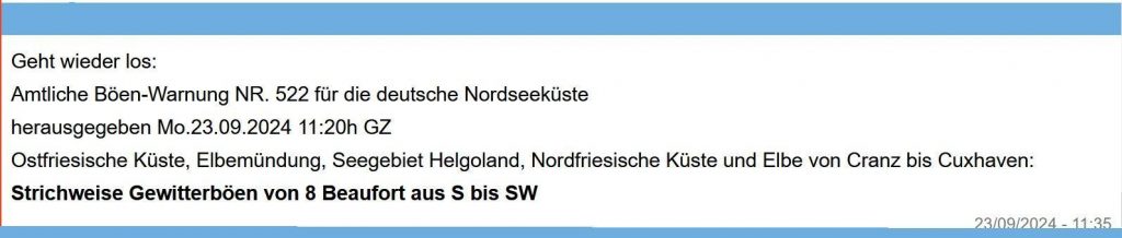 Süd 5, südwestdrehend, zunehmend 7, Schauer- und Gewitterböen, See zunehmend 2,5 Meter.