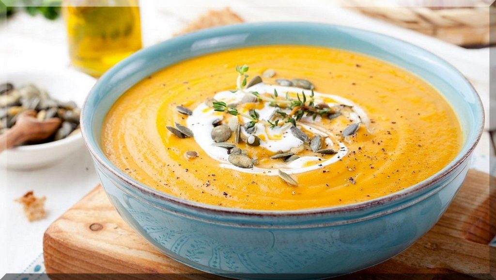 17 Uhr – Zum Abendessen gab es eine leckere Kürbissuppe (Kübis, Möhren, Kartoffeln püriert, Sahne, Petersilie, Salz, Pfeffer, Chiliflocken, Sonnenblumenkerne), Wiener u. Krakauer Würstchen, 1 Klecks Butter:
