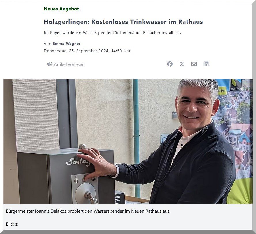 Im Foyer des Neuen Rathaus wurde ein Wasserspender installiert, welcher den Innenstadt-Besuchern zu Öffnungszeiten des Rathauses als kostenlose „Refill Station“ zur Nutzung bereitstehen soll „Wer sich im Rathaus am Wasserspender bedienen möchte, sollte also bitte sein eigenes Trinkwasserbehältnis mitbringen“, erklärt Thomas Egeler, der als Klimaschutzmanager der Stadt das Projekt „kostenloses Trinkwasser“ betreut hat. „Alternativ können an der Infotheke im Neuen Rathaus Mehrwegtrinkwasserflaschen zum Preis von 5 Euro käuflich erworben werden.“
