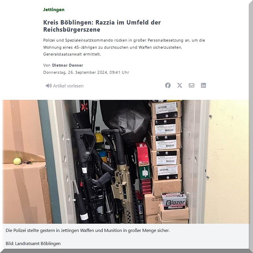 Jettingen. In den frühen Morgenstunden des Mittwochs rückte die Polizei unter anderem mit einem Spezialeinsatzkommando in Unterjettingen an. Ziel war ein Haus in der Öschelbronner Straße. Auf Antrag der Generalstaatsanwaltschaft Stuttgart durchsuchten die Beamten in einer groß angelegten Aktion die Wohnung eines 45-Jährigen. Dem Beschuldigten wird vorgeworfen, von der Planung eines gewaltsamen, gegen die freiheitlich-demokratische Grundordnung Deutschlands gerichteten Umsturzes Kenntnis gehabt zu haben.