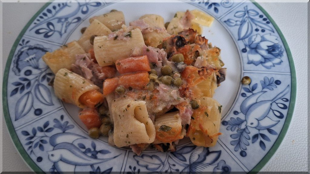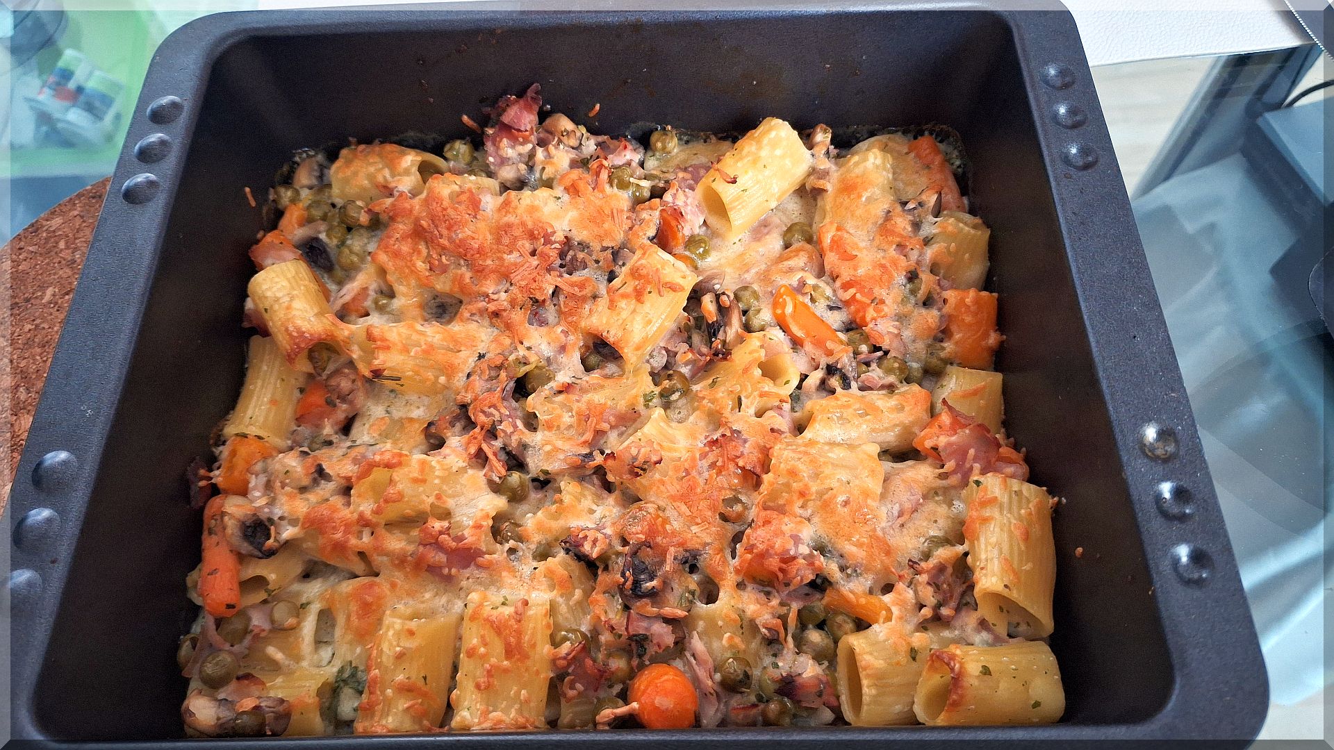 17:30 Uhr – Zum Abendessen gibtt es einen Nudelauflauf mit Kochschinken und Erbsen + Mören: