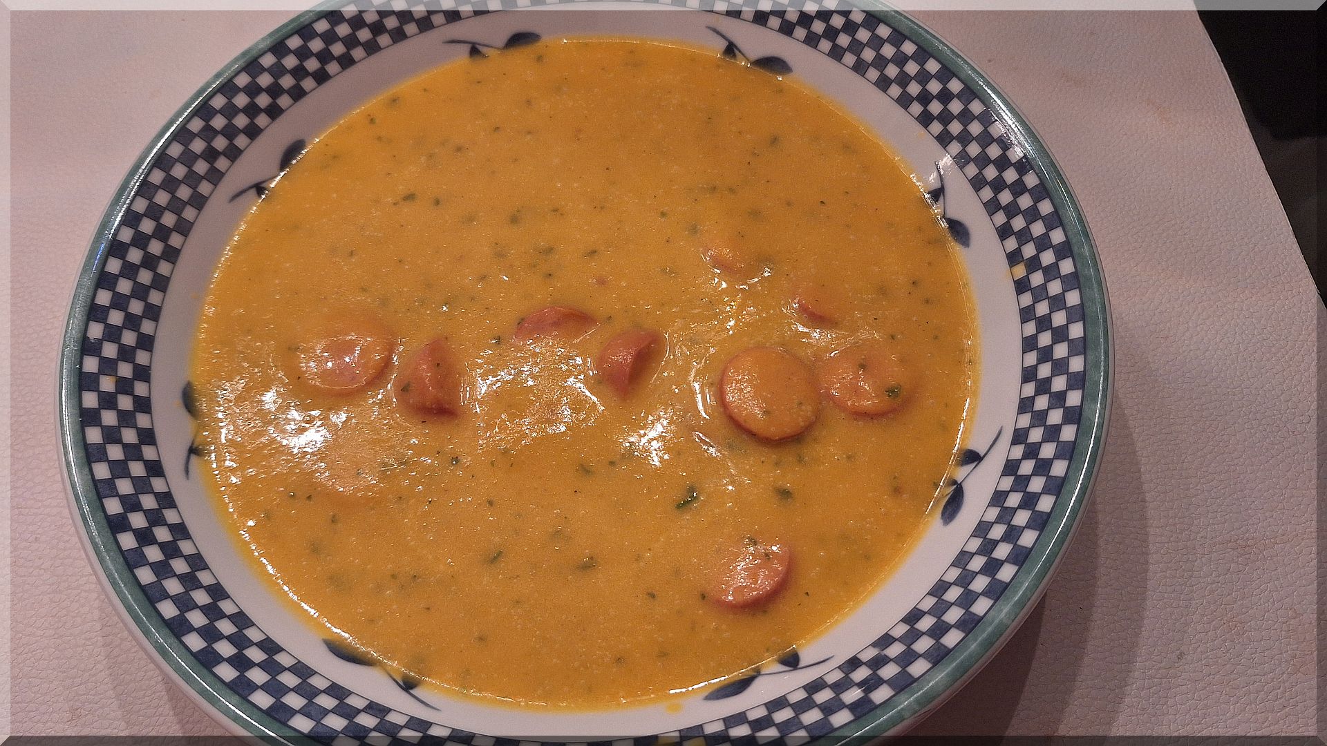 1/2 Hokkaido-Kürbis, 2 Karotten, 1 Kohlrabi und 2 Kartoffeln alles würfeln, 1/2 Lauchstange in Scheiben, 1 Zwiebel, im Topf alles mit Pflanzenöi 10 Minuten anbraten, mit 1 ltr. Gemüsebrühe ablöschen, 20 Minuten köcheln lassen, pürieren, Sahne und Gewürze, Petersilie, 2 Wiener Würstchen u. 1 Krakauer in Scheiben schneiden und untermengen.