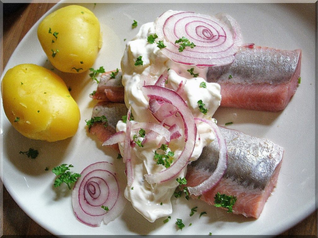 17:30 Uhr – Zum Abendessen gab es geräucherte Matjesfilets von der Fa. Nordsee mit weißer Soße (selbst gemacht) und Pellkartoffeln: